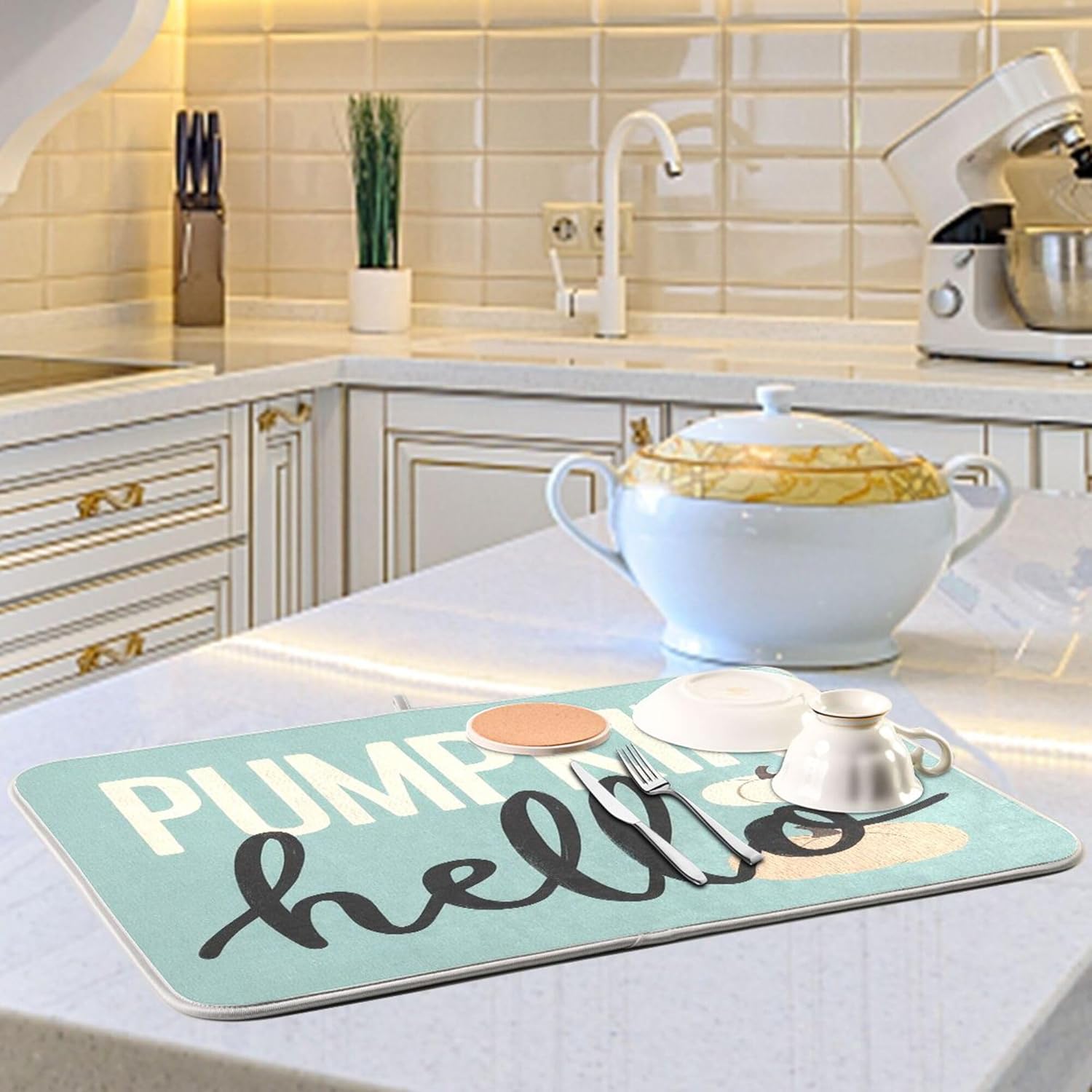 Hello Pumpkin Turquoise Fall Dish Drying Mat for Kitchen Countertop 18x24 Aqua Teal Autumn Large Drying Mat Reusable Quick Dry Dish Sink Mats Easy Clean Decorative Essentials