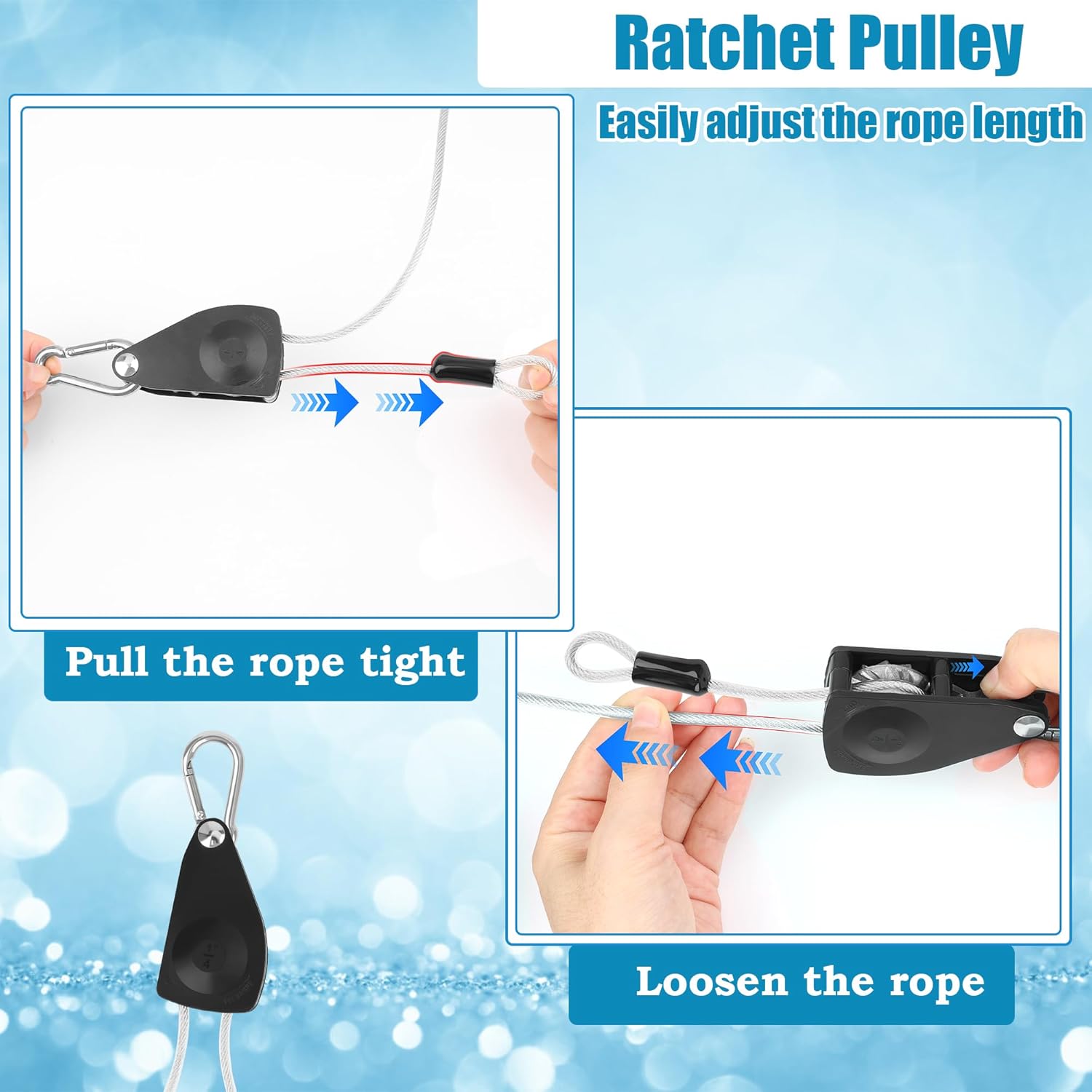 - 【Ratchet Pulley】: The ratchet pulley is easy to operate and adjusts the length of the travel clothesline cord. Pull the rope outward at one end to shorten it, and press the spring underneath the buckle to release it