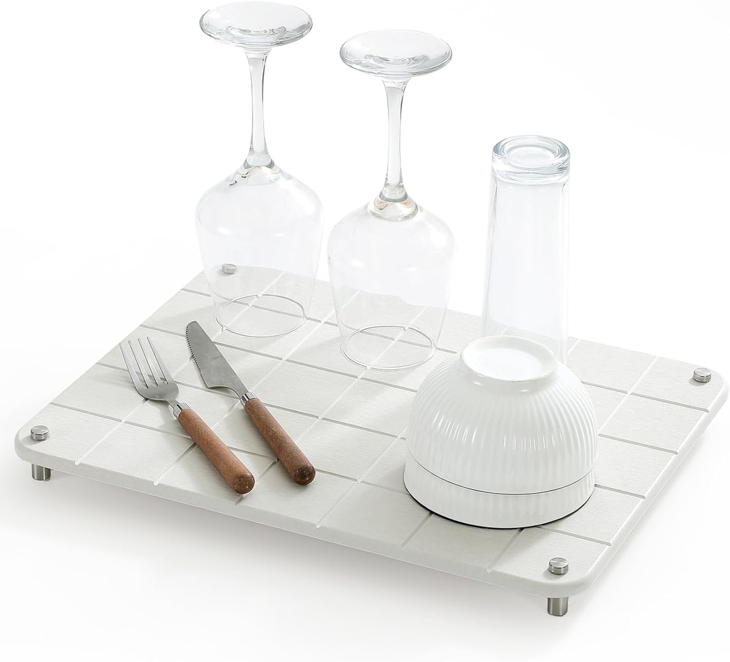 Stone Dish Drying Mat for Kitchen Counter, Water Absorbing Bathroom Tray Sink Organizer, Diatomaceous Earth Countertop Dish Rack Riser Sponge Holder Soap Dish, Gray Beige, 16" x 12"
