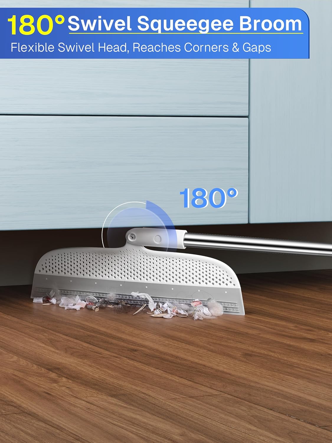 - 【180° Rotating Head】This floor squeegee features a flexible pivoting head that easily reaches corners, under furniture, and tight spaces where vacuums can’t go.