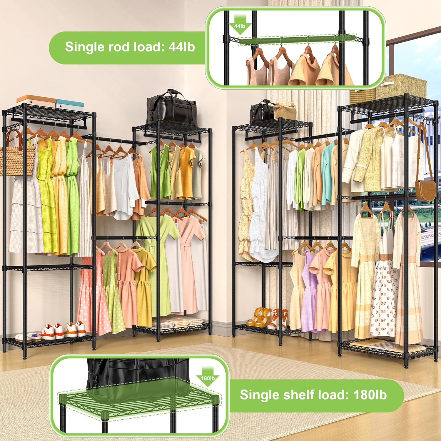 - Versatile Closet Storage System: Large Garment Rack features 5 shelves, 5 rods, and 1 side hook, making it ideal for organizing shirts, jackets, pants, boots/shoes, bags, luggage, and more.