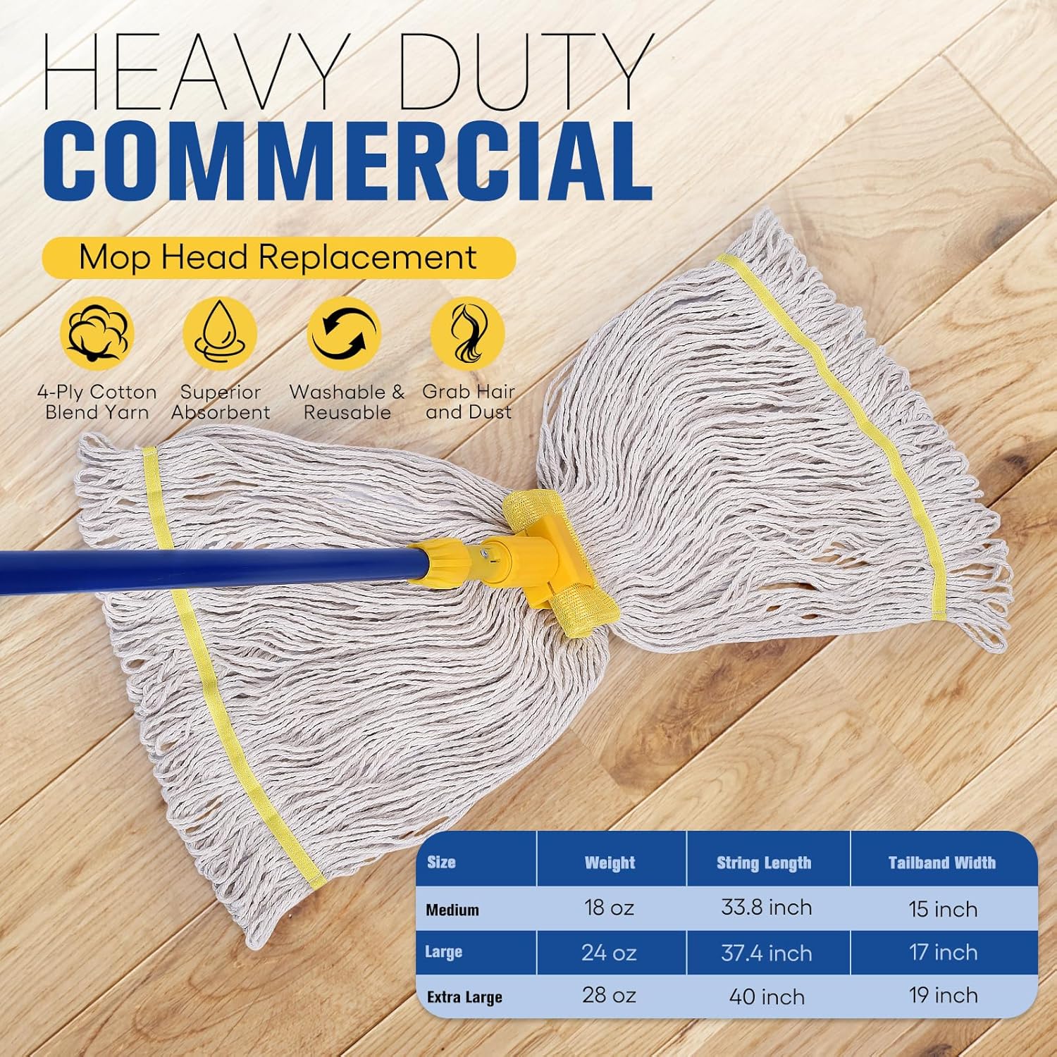 - Washable and Long-Lasting: Commercial mop heads are launderable for extended long-term usage. Long-lasting fibers allow the mop head to be washed many times giving it a longer service life. This washable mop head is launderable up to 100 times! NOTE: Do not use dryer after laundering to avoid shrinkage and loosen string, air-drying is recommended.