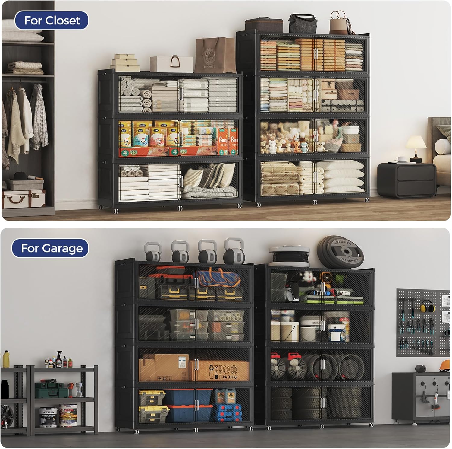- 【Two Ways to Open & Magnetic Doors】The collapsible storage bins with lids and wheels feature a dual access way, allowing for both top and front door openings, and with clear brown windows for easy visibility. The super huge storage bins with open front doors are equipped with magnetic lock buckles to prevent dust from entering the cabinet.