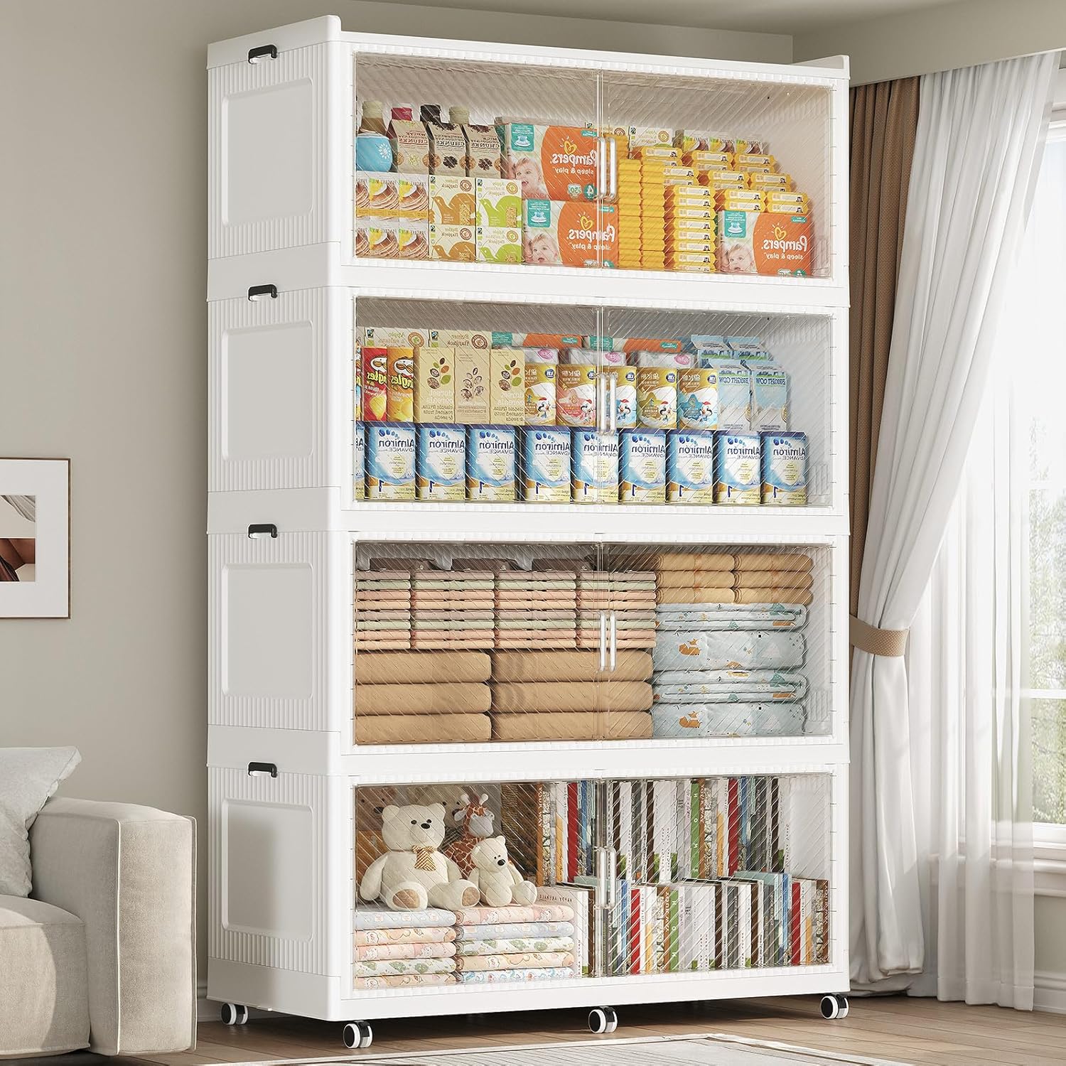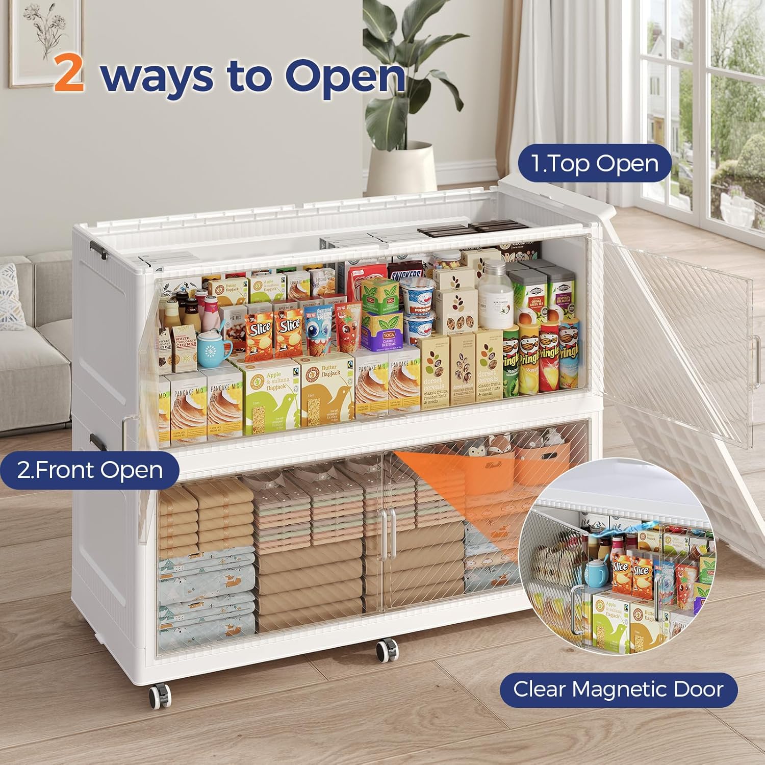 - 【Two Ways to Open & Magnetic Doors】The collapsible storage bins with lids and wheels feature a dual access way, allowing for both top and front door openings, and with clear brown windows for easy visibility. The super huge storage bins with open front doors are equipped with magnetic lock buckles to prevent dust from entering the cabinet.