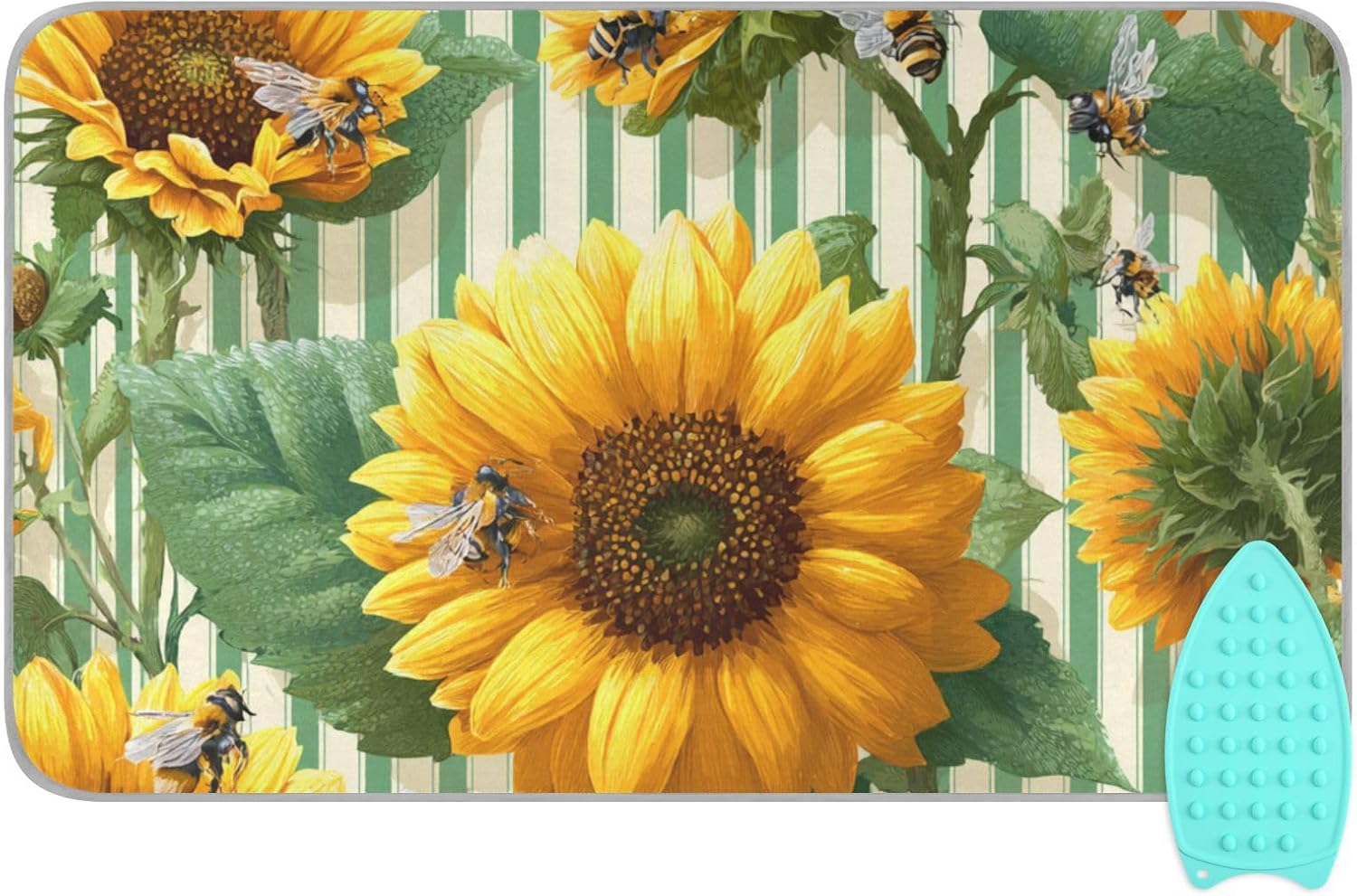 Green Striped Sunflowers and Bees Ironing Mat for Table top Portable Ironing Pad Blanket for Washer Dryer Countertop Travel