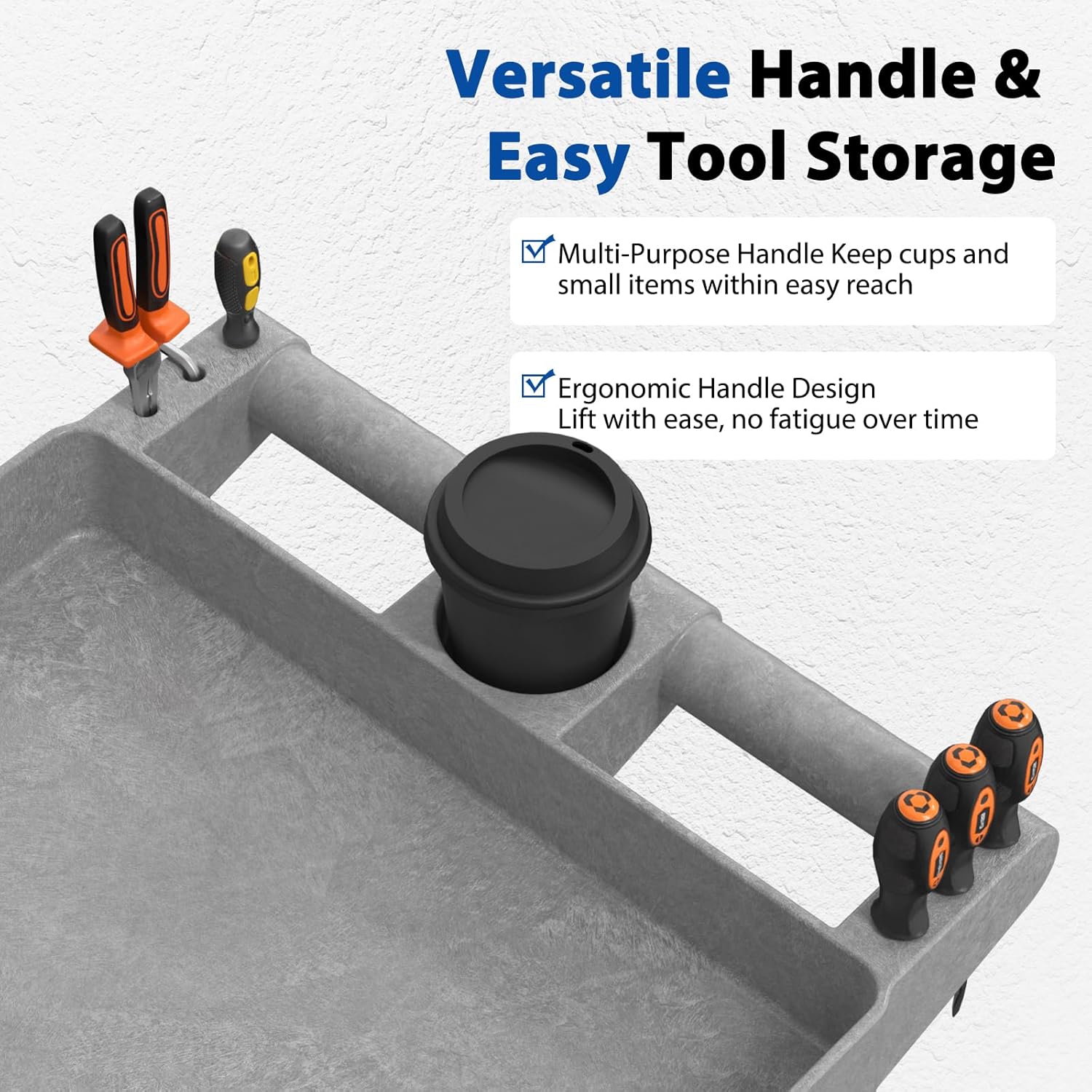 - 【Ergonomic Multifunctional Handle】 Dual handles designed for comfort and reduced fatigue, with a central storage space for cups, tools, or small parts. Perfect for keeping essentials within reach when using this work cart on wheels or rolling tool cart.