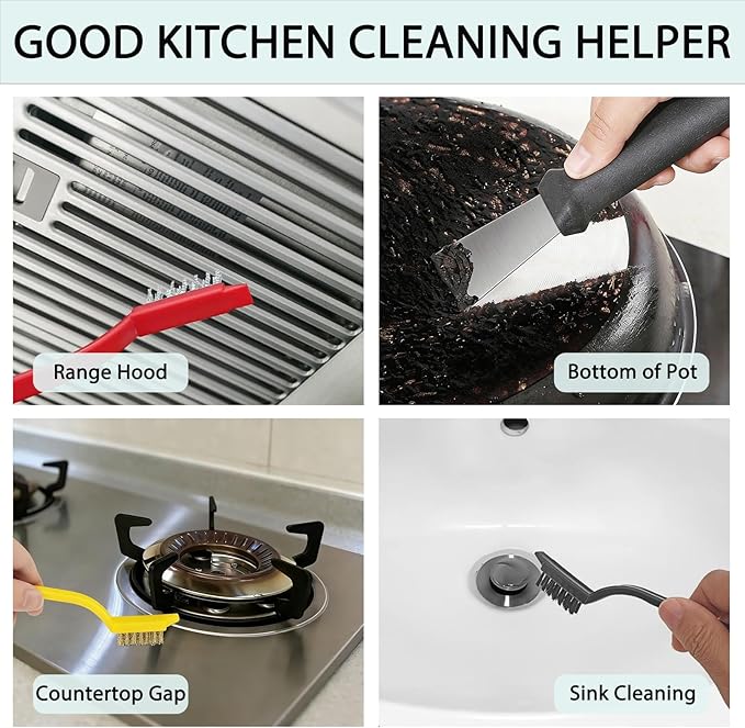- SMALL BRUSH SIZES: Featuring skinny, tapered brush profiles, these tools are perfect for deep cleaning tight gaps and corners in appliances, backsplashes, grout, and more.This tiny scrub brush is suitable for cleaning various crevices and corners, including faucets and tub grout, shower door grooves, toilet seat crevices, floor tile grout, sliding glass door tracks, sink and washing machine crevices, refrigerator interiors, window seals, lime scale around faucets, window tracks, kitchen stove tops, car window sills, keyboard gaps and more.