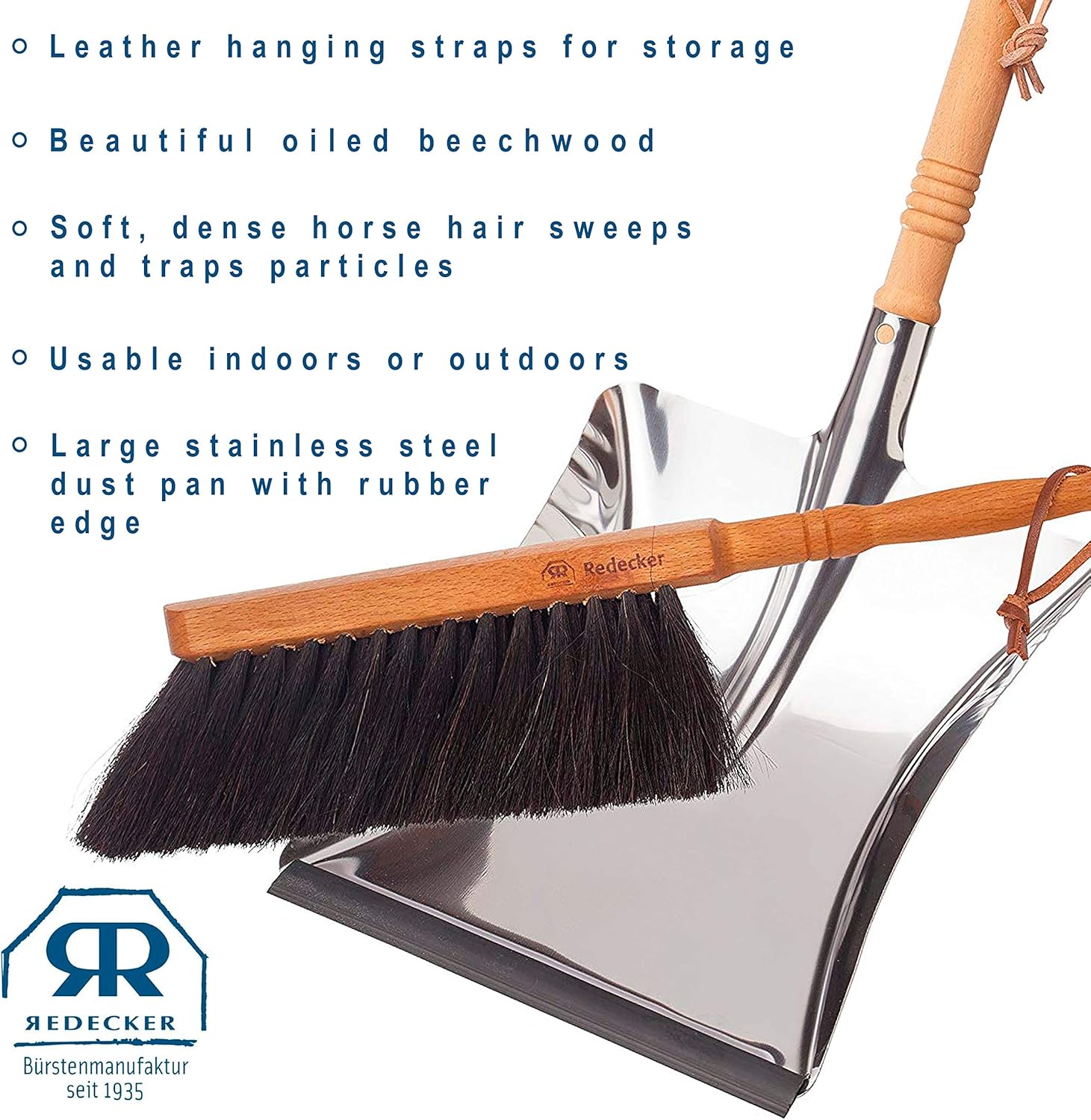 REDECKER Horsehair Fiber Hand Brush and Dust Pan Set - Wooden Broom and Dustpan Set for Home - Outdoor Dust Pan and Brush - Oiled Beechwood Handles - Large Capacity Stainless Steel Dust Pan