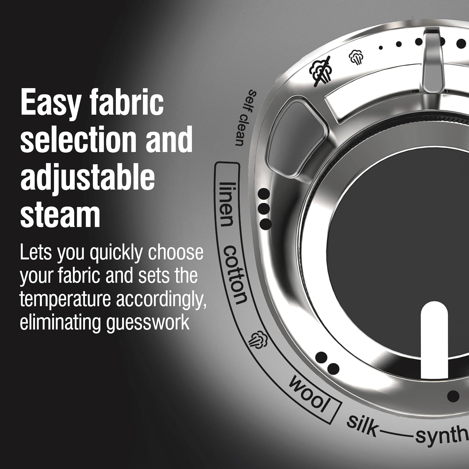 - Fabric Guide. Choose Your Fabric Type and the IRON Sets the Temperature Accordingly, Eliminating the Guesswork.