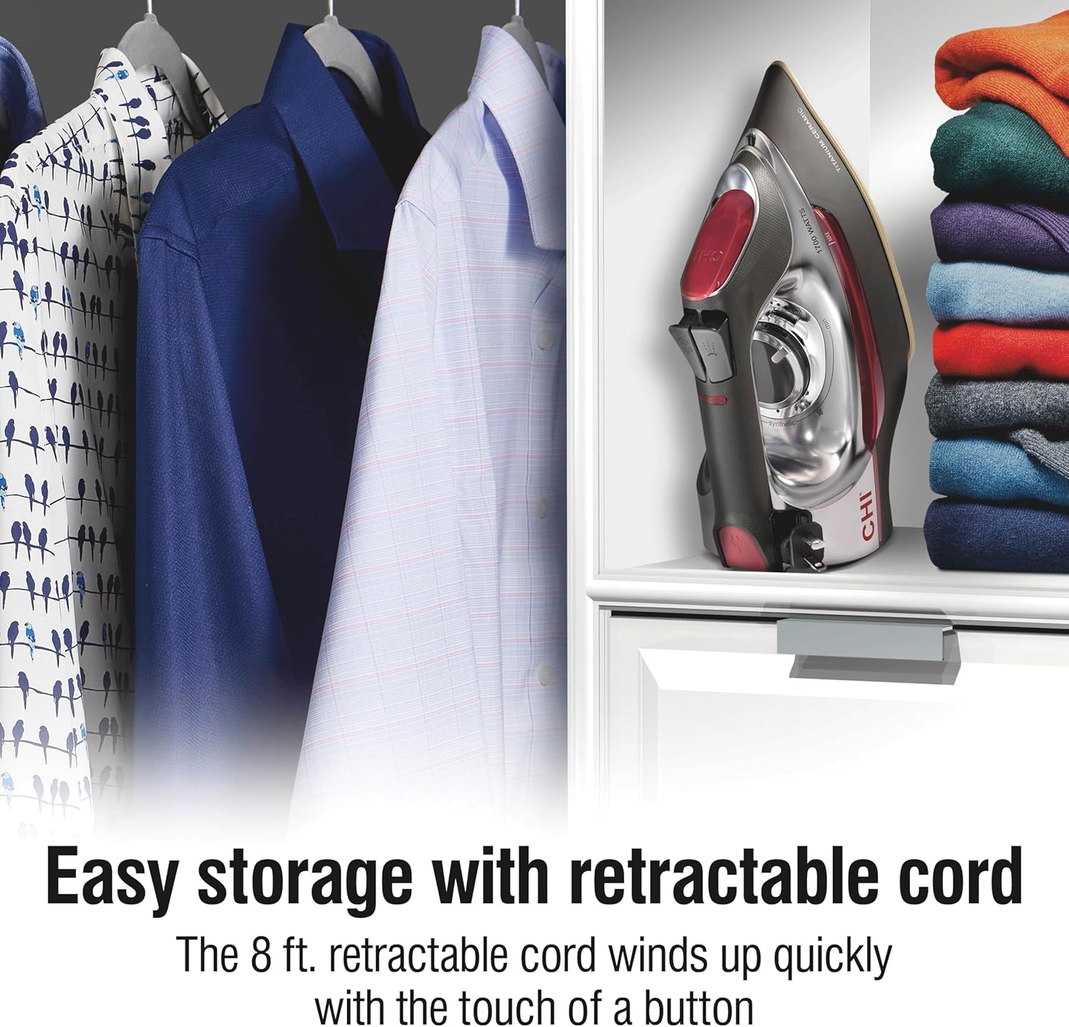 - Retractable Cord. for Easy Use and Storage, the 8 FT. Retractable Cord Winds up Quickly With the Touch of a Button. Makes Your IRON Storage More Convenient and Tidy.