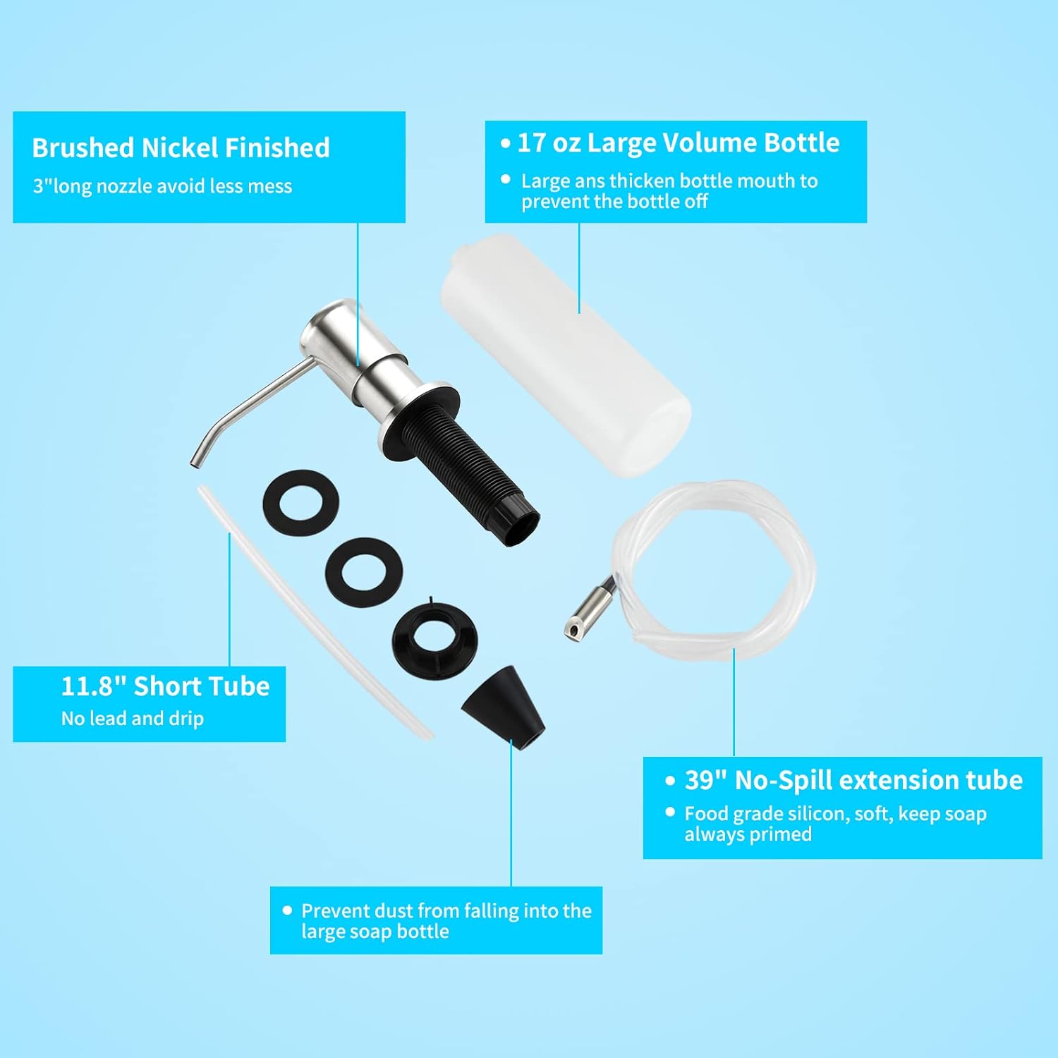 - 💧【 PREMIUM QUALITY 】 Our built in sink soap dispensers are made with 304 stainless steel pump head with durable PVC soap bottle. The 1m silicone extension tube in food grade quality is soft and elastic, brushed Nickel surface makes it resistant to corrosion and rust. Countertop soap dispenser nozzle (can swivel 360°)avoid the soap splash,the pump always stay primed.