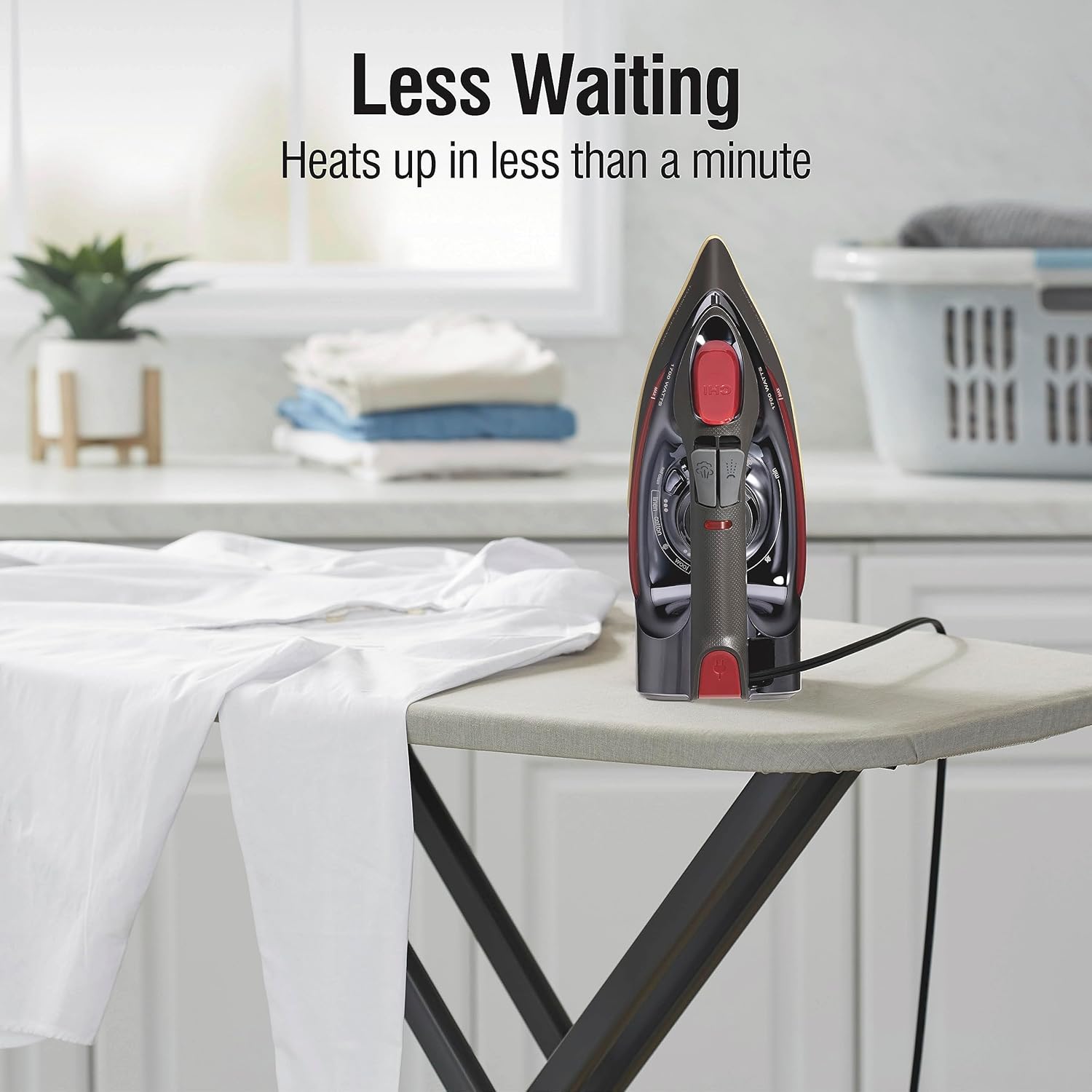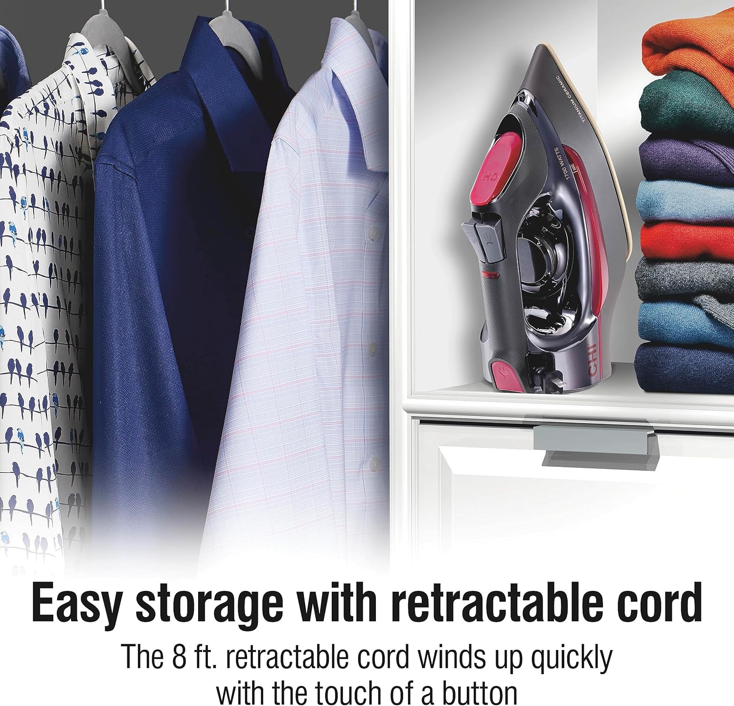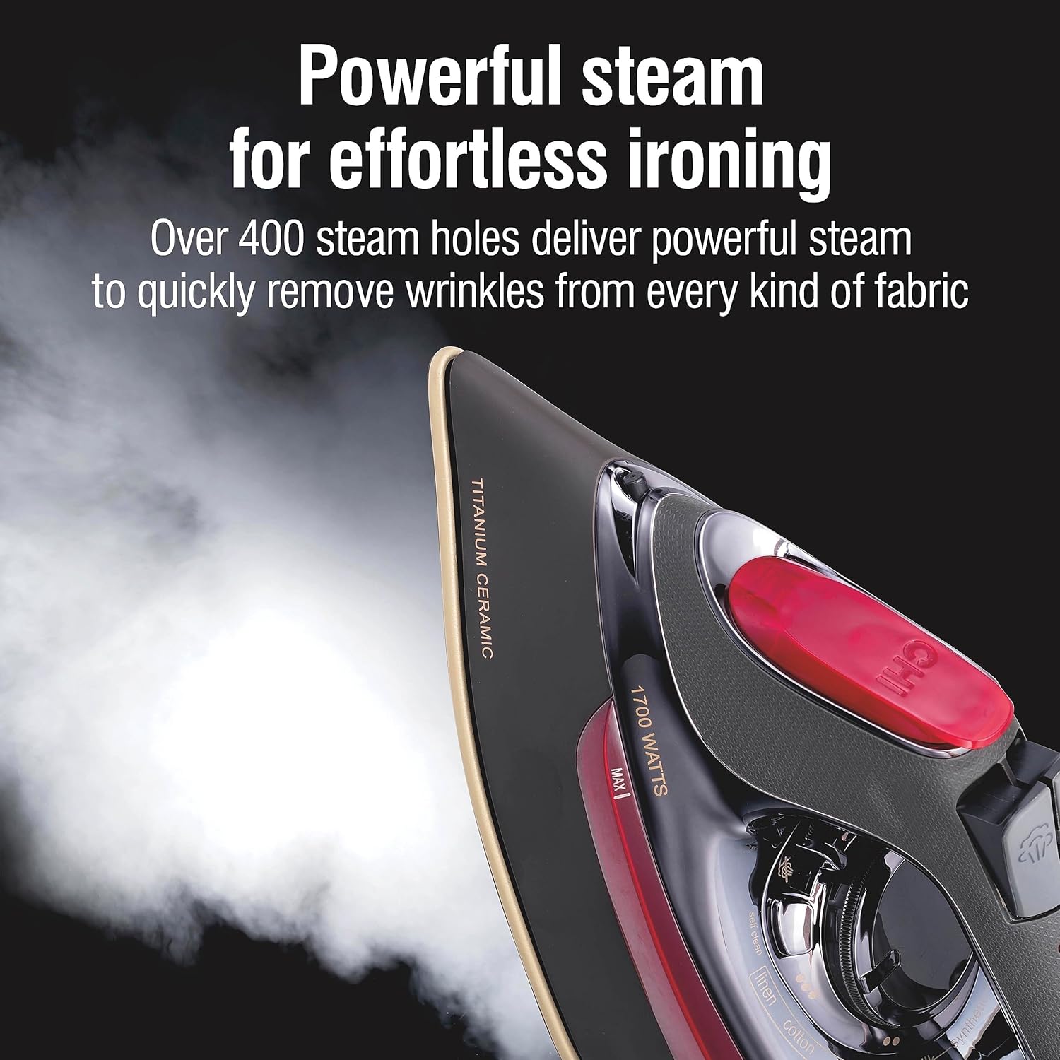 CHI Steam Iron for Clothes with 8’ Retractable Cord, 1700 Watts, 3-Way Auto Shutoff, 400+ Holes, Professional Grade, Temperature Control Dial, Titanium Infused Ceramic Soleplate, Black/Chrome (13109)