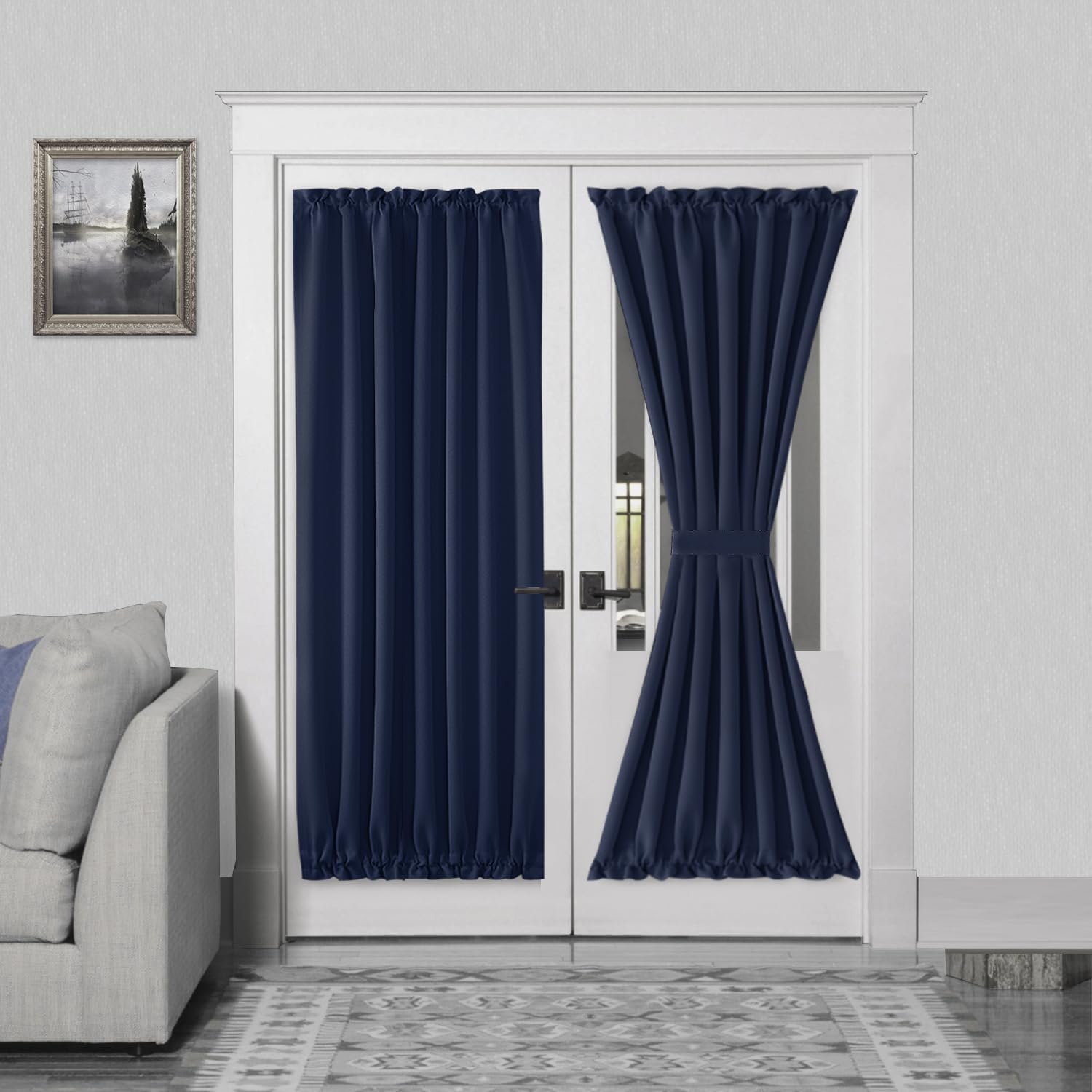 DWCN French Door Curtains – Rod Pocket Thermal Blackout Curtain for Doors with Glass Window, Kitchen and Patio Doors for Privacy, 54 X 72 Inches Long, 1 Curtain Panel with Tieback, Navy Blue