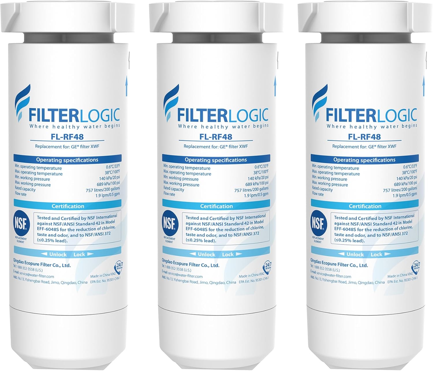 Filterlogic FL-RF48 Replacement for GE® XWF, NSF Certified Refrigerator Water Filter, 3 Filters(Not XWFE®)