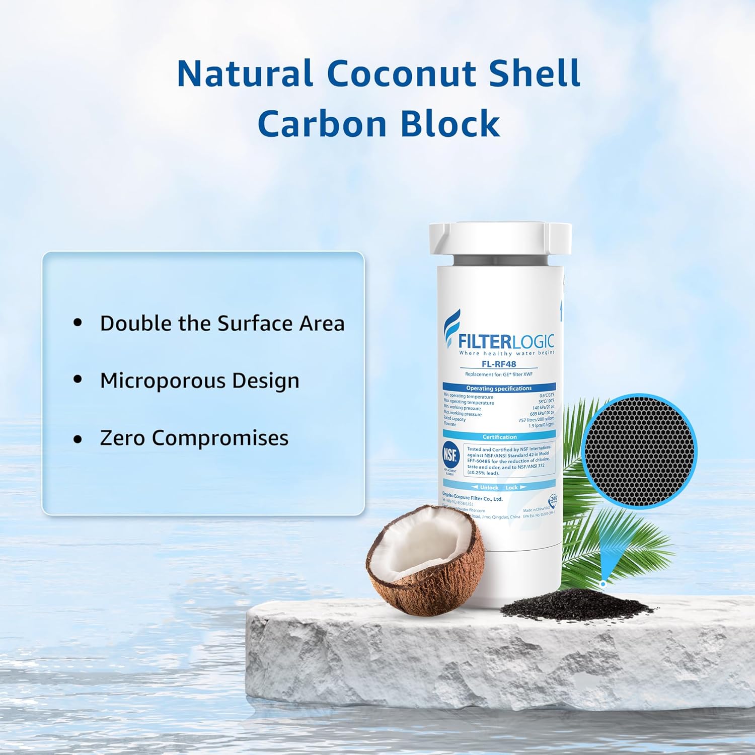 - Premium filter material: Here at Filterlogic, we adopt 100% natural coconut shell carbon block containing twice the surface area and more micropores than an inferior carbon block.