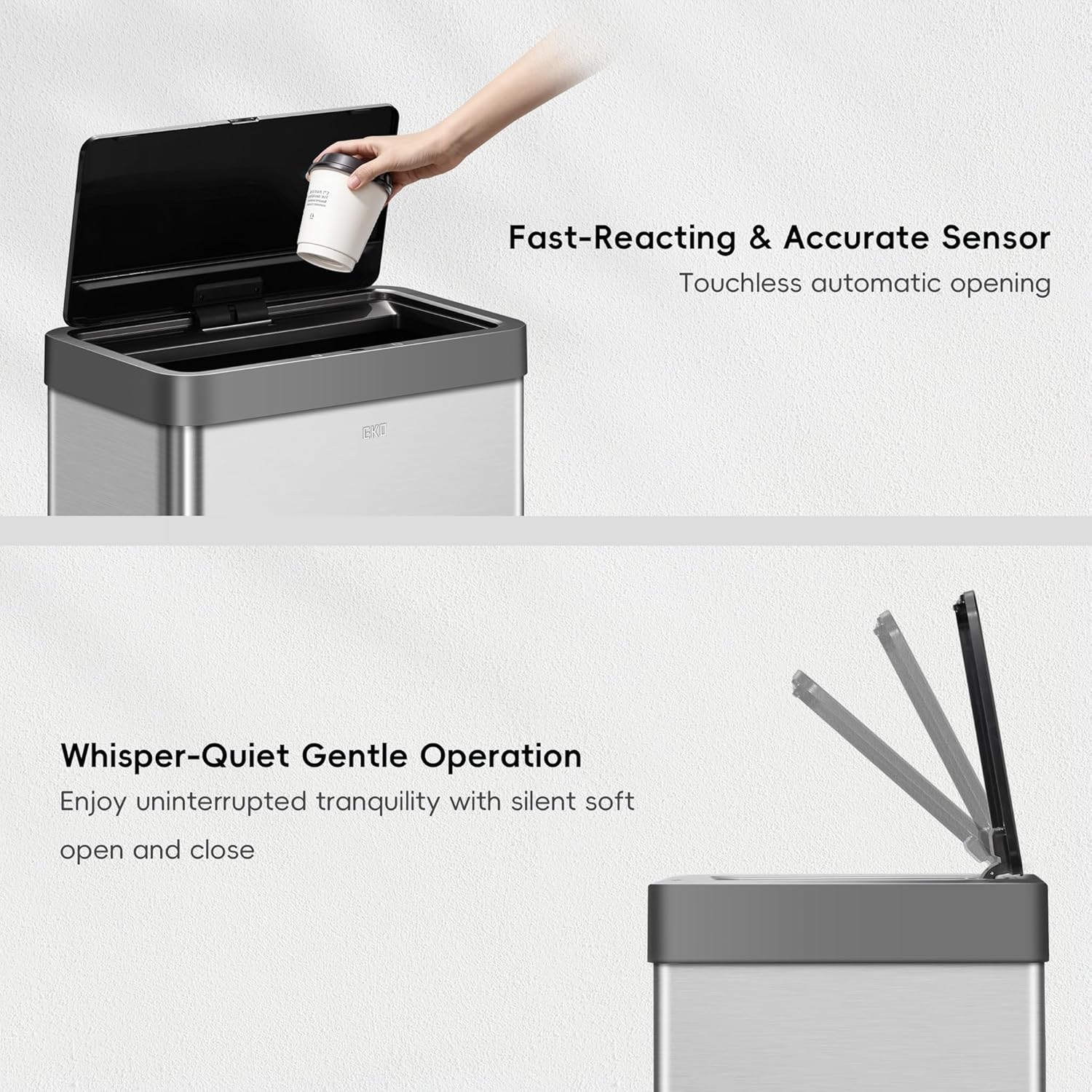 - PREMIUM MOTION SENSOR TECHNOLOGY - Experience the smoothest, most seamless lid opening and closing technology with this EKO hands-free automatic trash can.