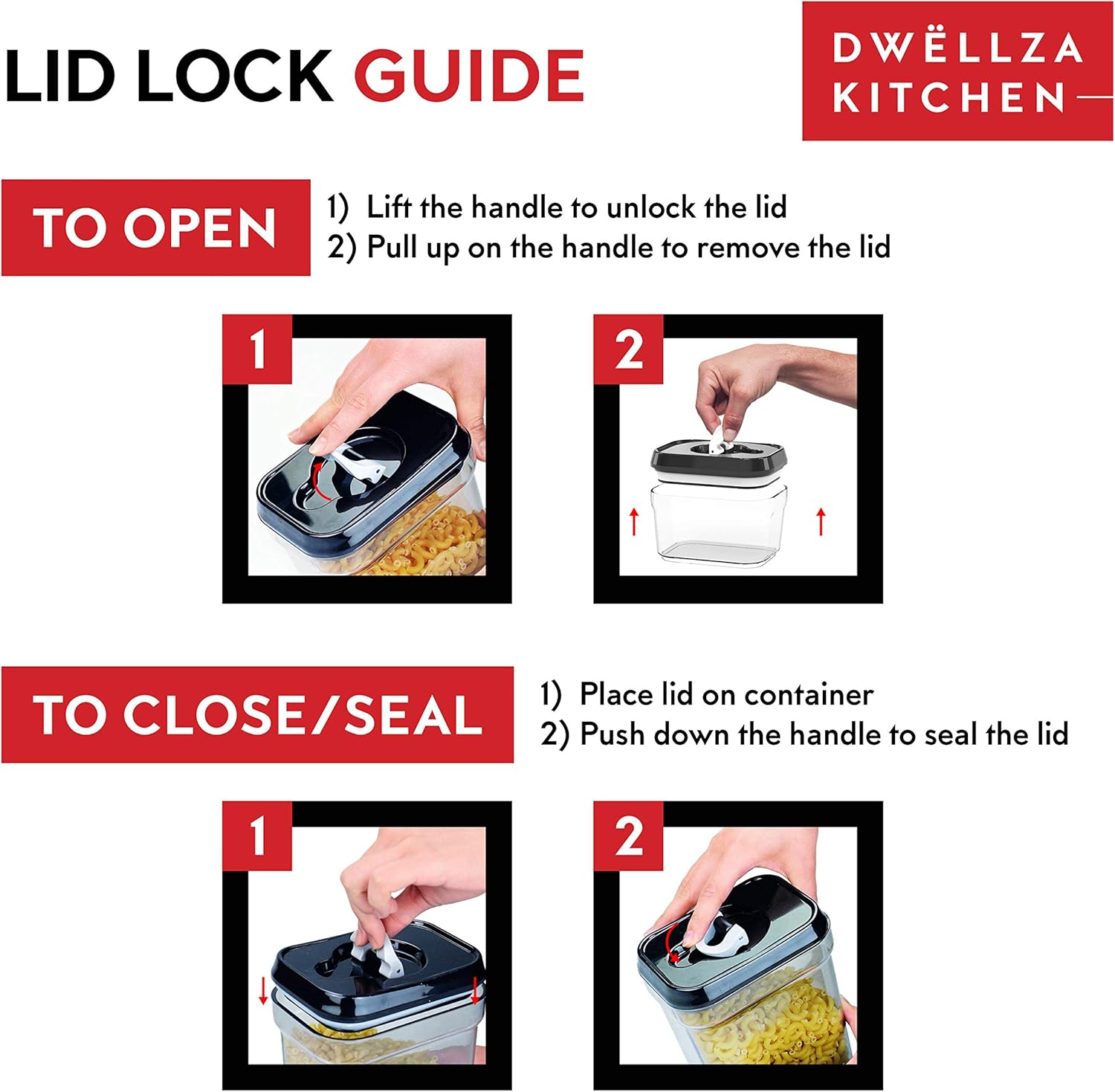 - Enjoy Your Meal With Fresh Food: Keep your foods fresh with our very easy to use airtight lid-lock mechanism. Our food storage containers create an airtight seal by simply pushing down the ring on the lid. Lift the ring and push up whenever you want to open the canisters! These containers are also dishwasher safe, the lids are the best to wash by hand using a damp cloth. (not recommended to remove the silicone seal)