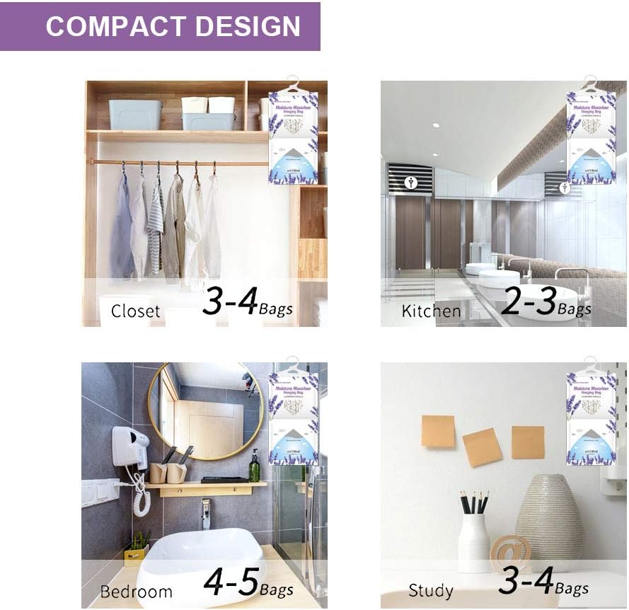 - The hanging Bag has strong hook design,is perfect dehumidifier for closet,bedroom,kitchen,bathroom.