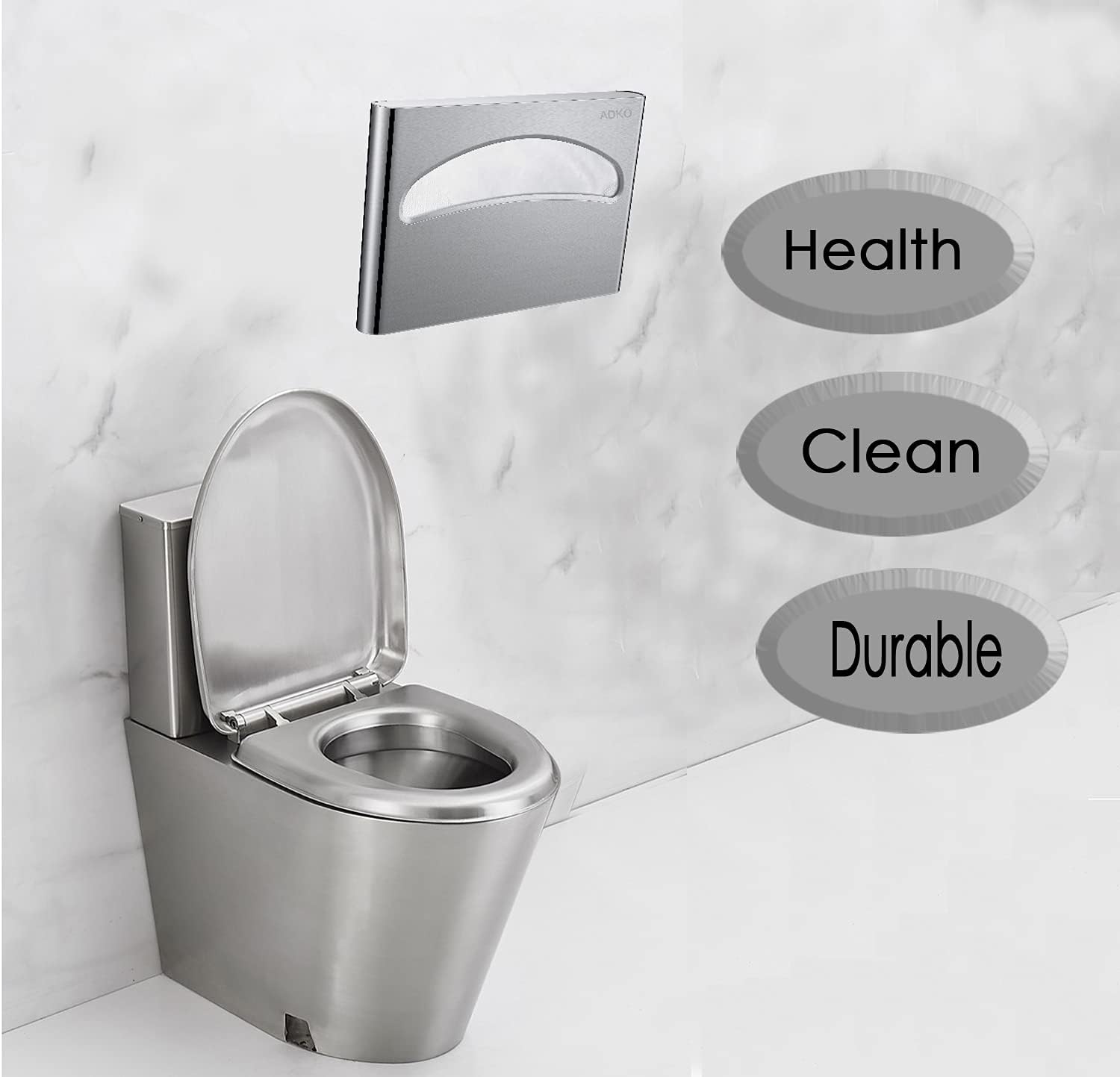 - PREMIUM- GRADE CONSTRUCTION Made in Durably 18/8 stainless steel, ADKO Toilet Seat Cover Dispenser can provide long-lasting strength and use for more then 5 years to come. 2 YEARS MANUFACTURER’S WARRANTY.