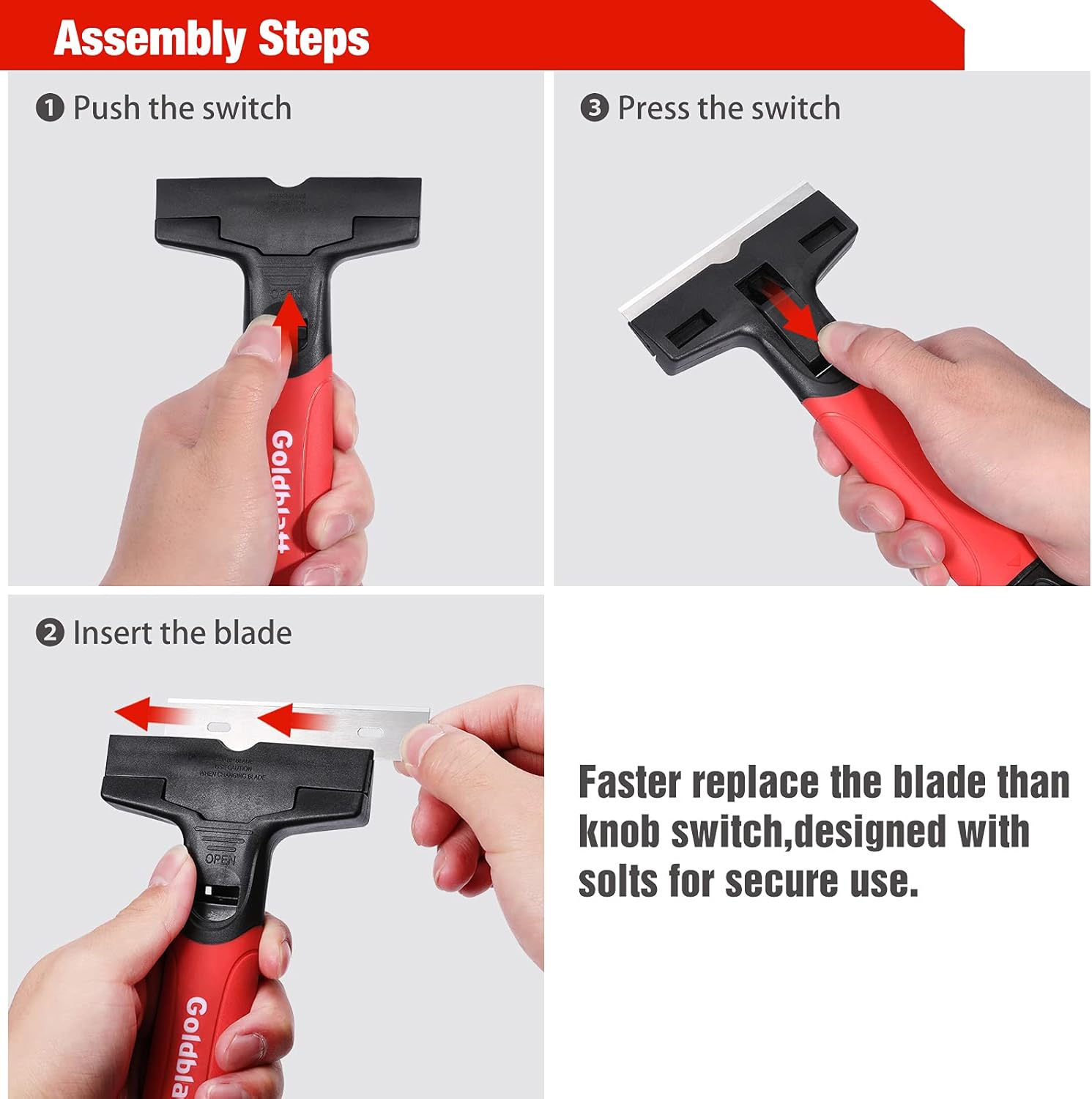 - Easy Assembly: Unlike other scrapers that use knob to assemble blades, Goldblatt scraper set just need to pull and push the switch to replace the blades, No worry about losing knob or bolt. Slot design will securely fix the blades in place for safety use