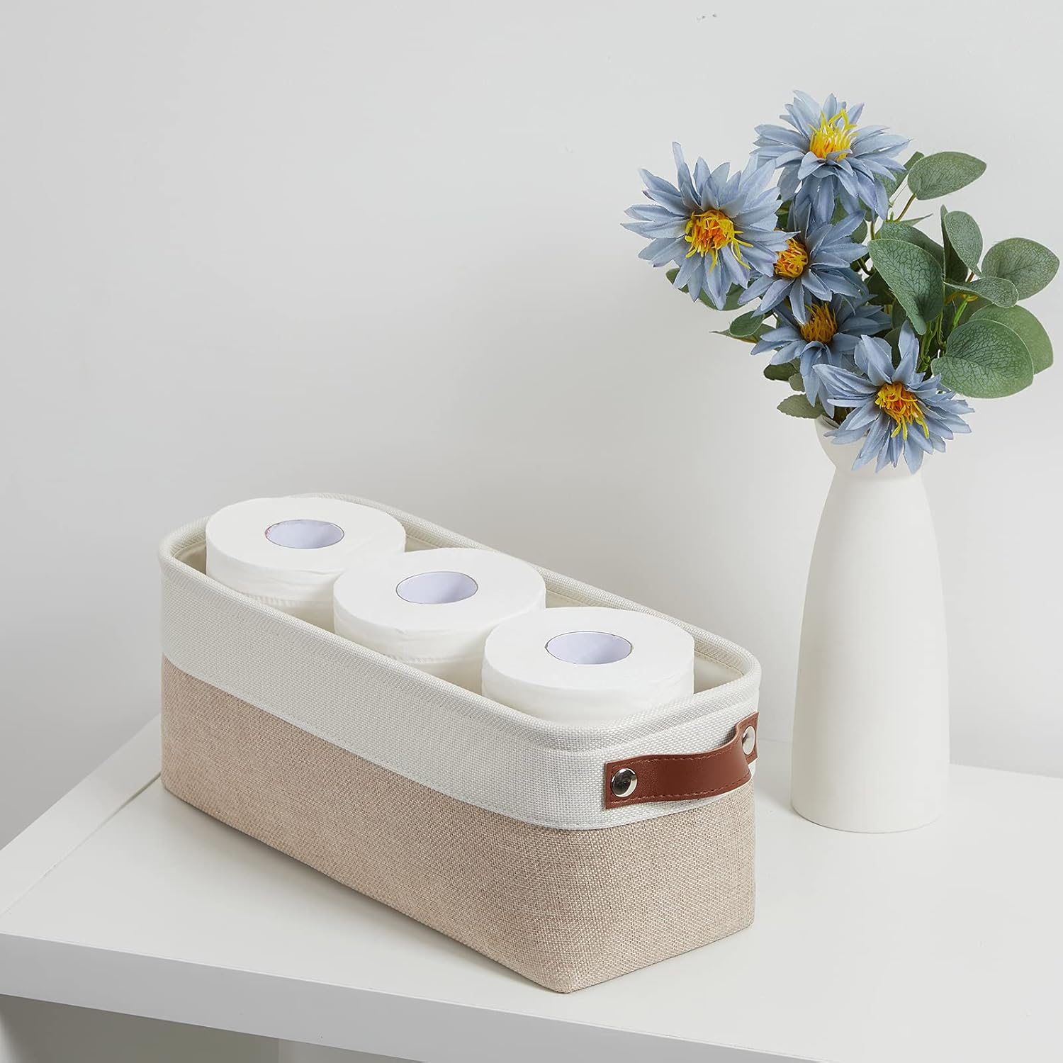 - 【Unique Design & Modern & Decorative】Set of 2 small toilet paper baskets, dimensions(each): 15(L) x 6(W) x 5.5(H) inches. Fabric storage baskets bring you organizing convenience and a sweet home. Great for socks, underwear, books, magazines, toys, pet products, wipes, towels, decorations, office supplies, DVDs, and gifts. The fabric baskets with neutral colors can match a lot of home styles - keeping your home nice and tidy.