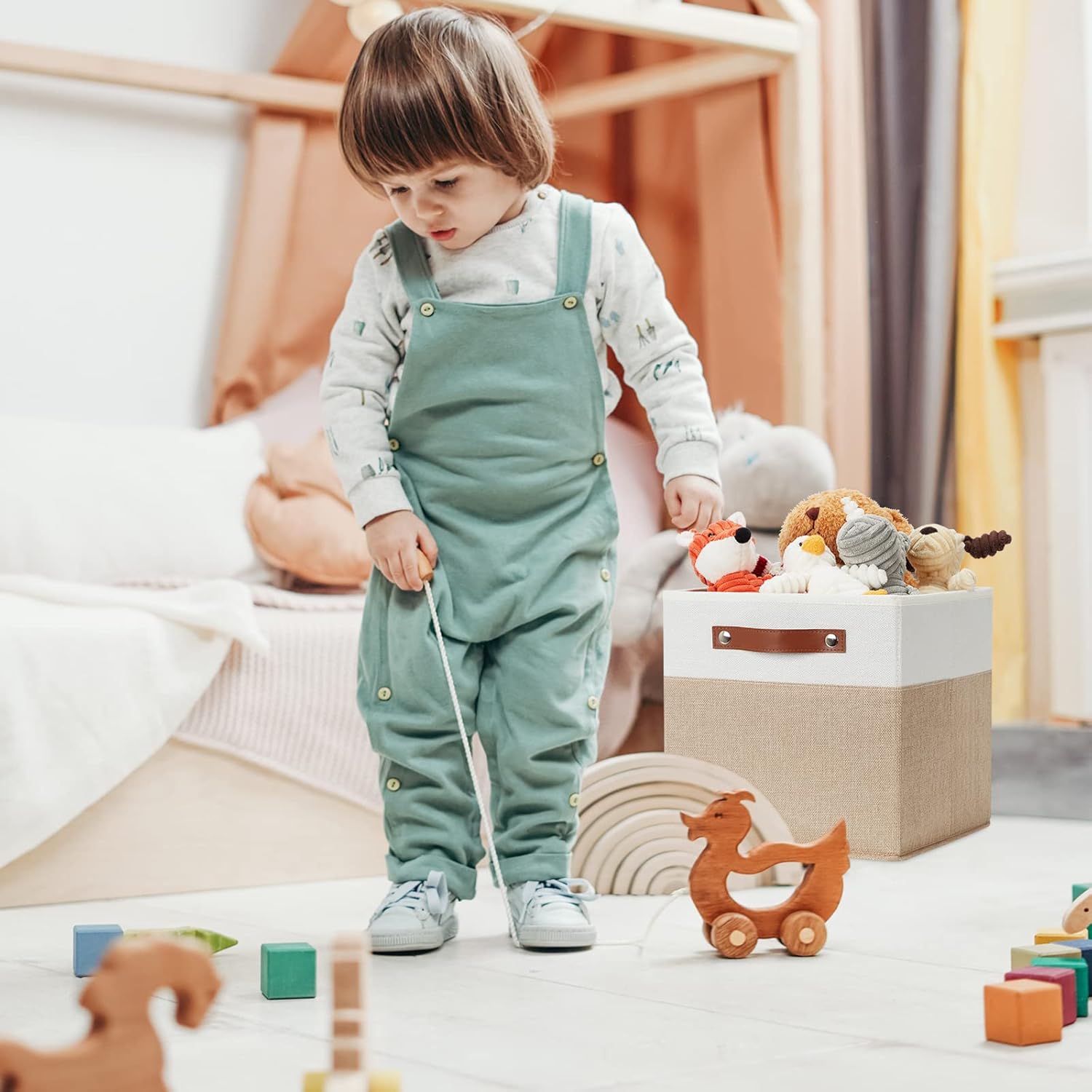- 【Material】These cube storage bins are constructed of sturdy and attractive linen & EVA with linen interior lining. The sturdy leather handles make it easy to carry or pull off and out of shelves.