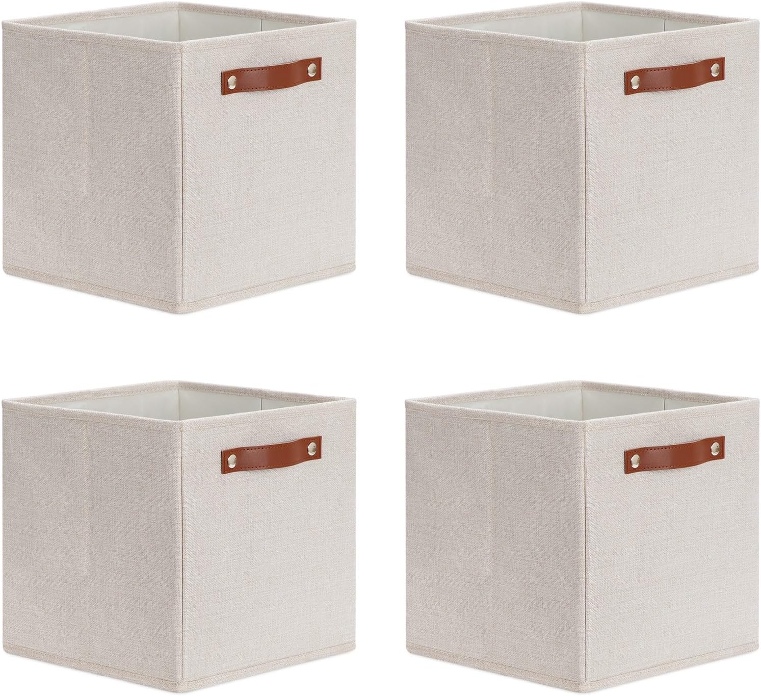 - 【Material】These cube storage bins are constructed of sturdy and attractive linen & EVA with linen interior lining. The sturdy leather handles make it easy to carry or pull off and out of shelves.
