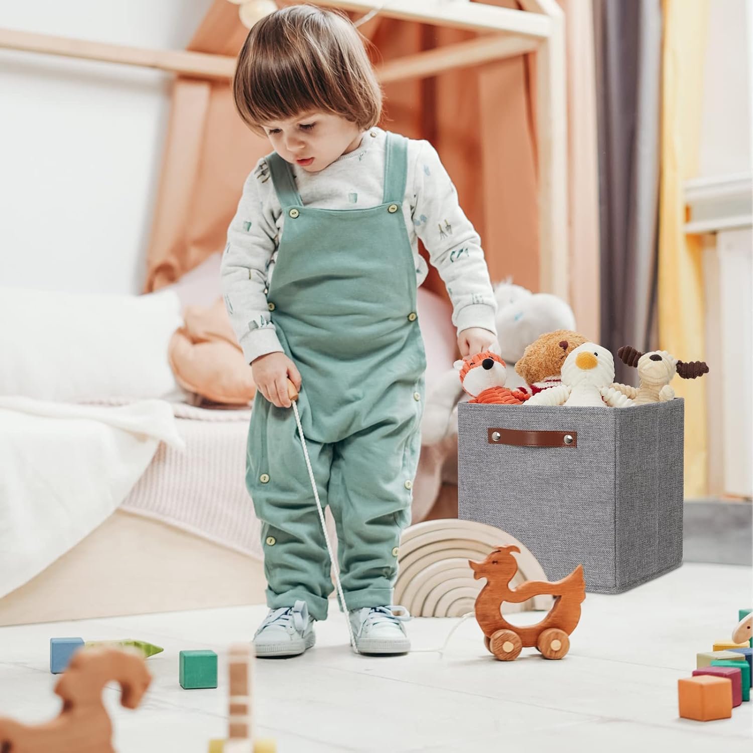 - 【Material】These cube storage bins are constructed of sturdy and attractive linen & EVA with linen interior lining. The sturdy leather handles make it easy to carry or pull off and out of shelves.