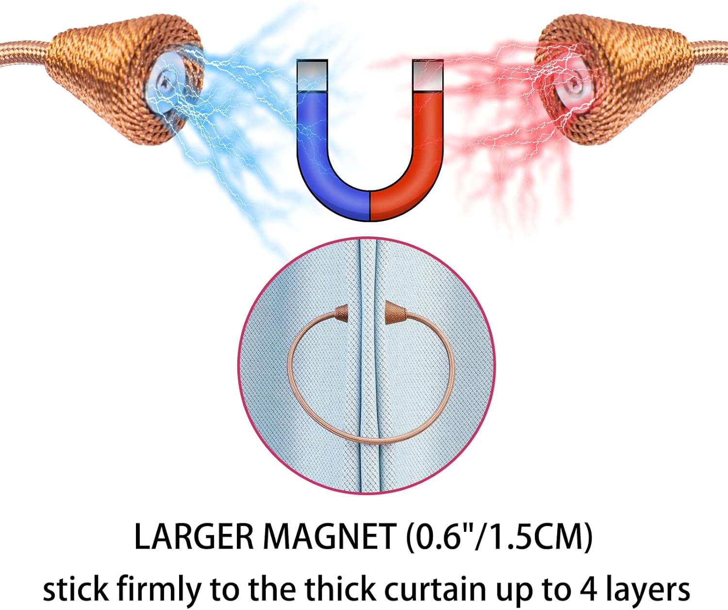 - WIDE APPLICATION: The length and binding method can be adjusted freely according to the thickness of the curtain. It is widely used in curtains in different places such as bedroom, living room, dining room, bathroom, kitchen, office, courtyard and so on. Different colors of magnetic drape tiebacks adorn your curtains, which can change different styles, giving the curtains a unique charm