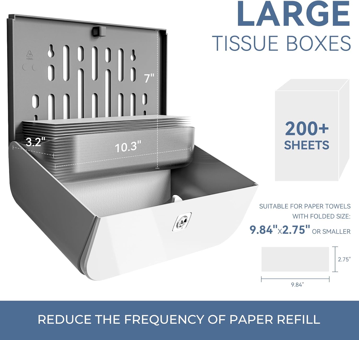- 【Wide Compatibility & 200-Sheet Capacity】 Holds Most Standard C-Fold & Multi-Fold Paper Towels! Accommodates towels up to 10.2"L x 3.1"W(or smaller). The large capacity minimizes refill frequency, making it ideal for high-traffic areas. (Please Note: We recommend confirming your paper towel dimensions for optimal fit.)