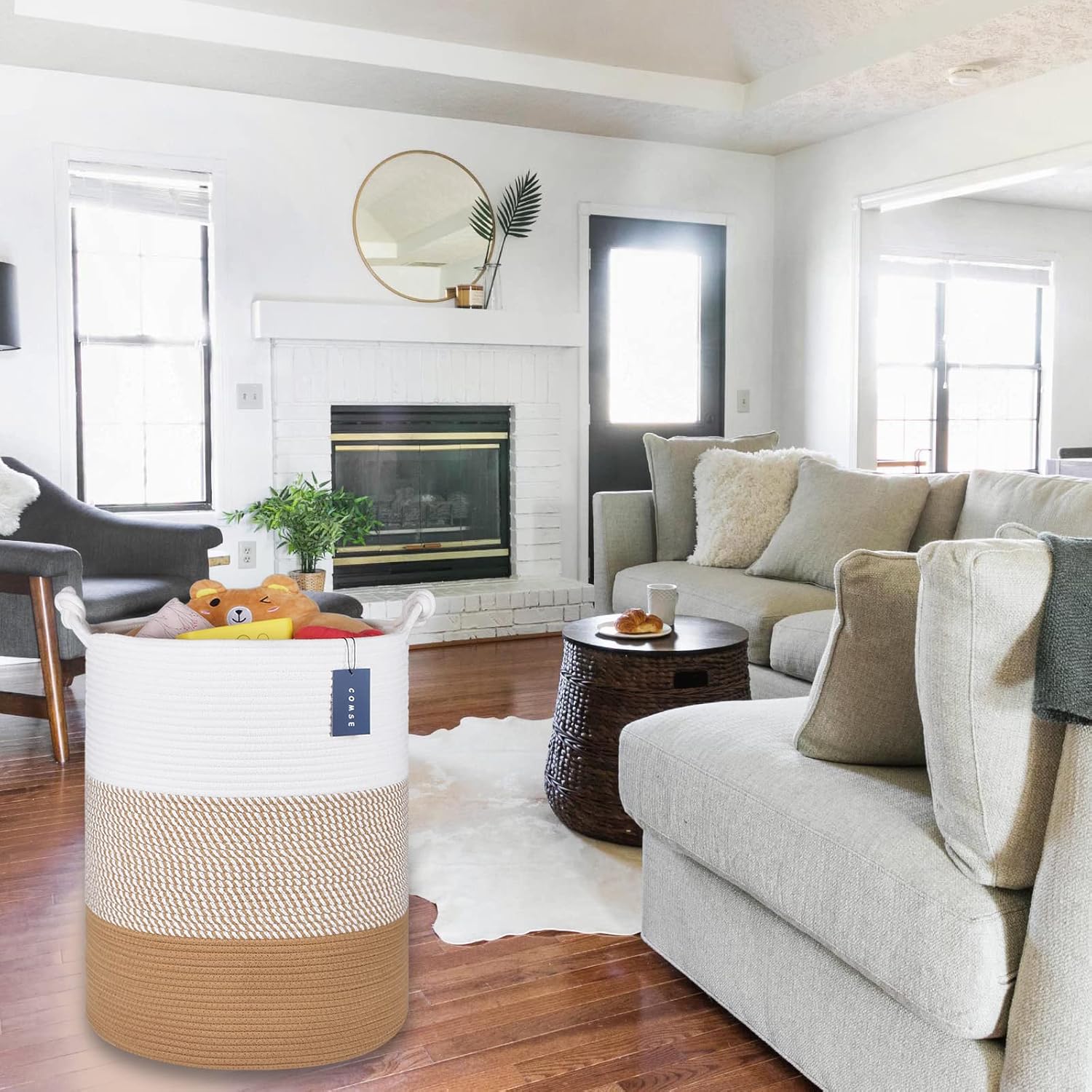 COMSE Extra Large Blanket Basket, Tall Woven Storage Basket, Nursery Hamper, 15.7”x 21.7”, Cotton Rope Laundry Hamper for Toys Clothes Towels, White/Camel
