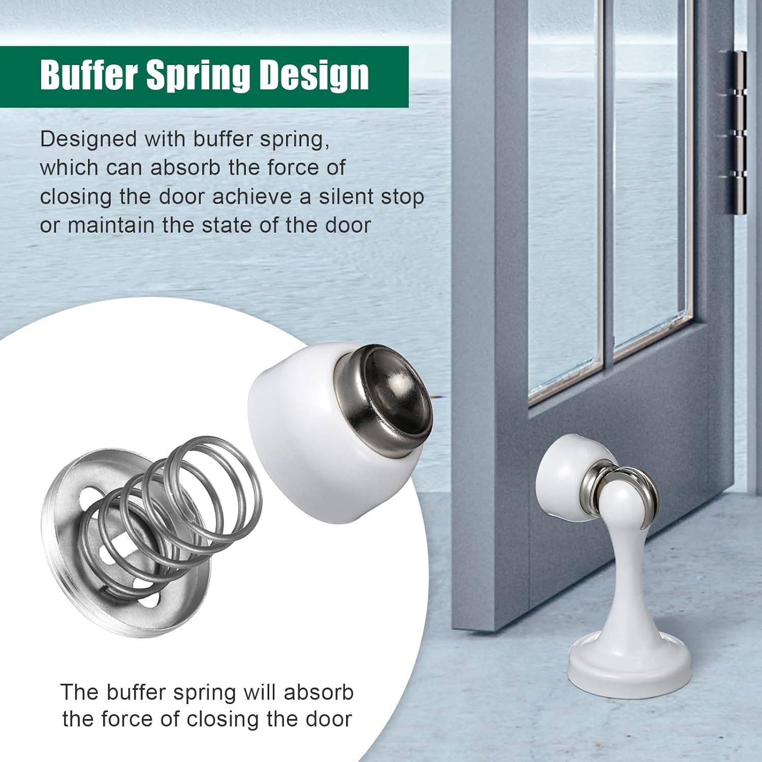 - Powerful Magnetic: the white magnetic door stop has magnetic, shock absorb spring helps door stop absorb the force of slamming and minimize noise property;The stick has the magnet inside and single round base is metal plate which has spring load inside; Both of them can be firmly absorbing each other and work well to catch door