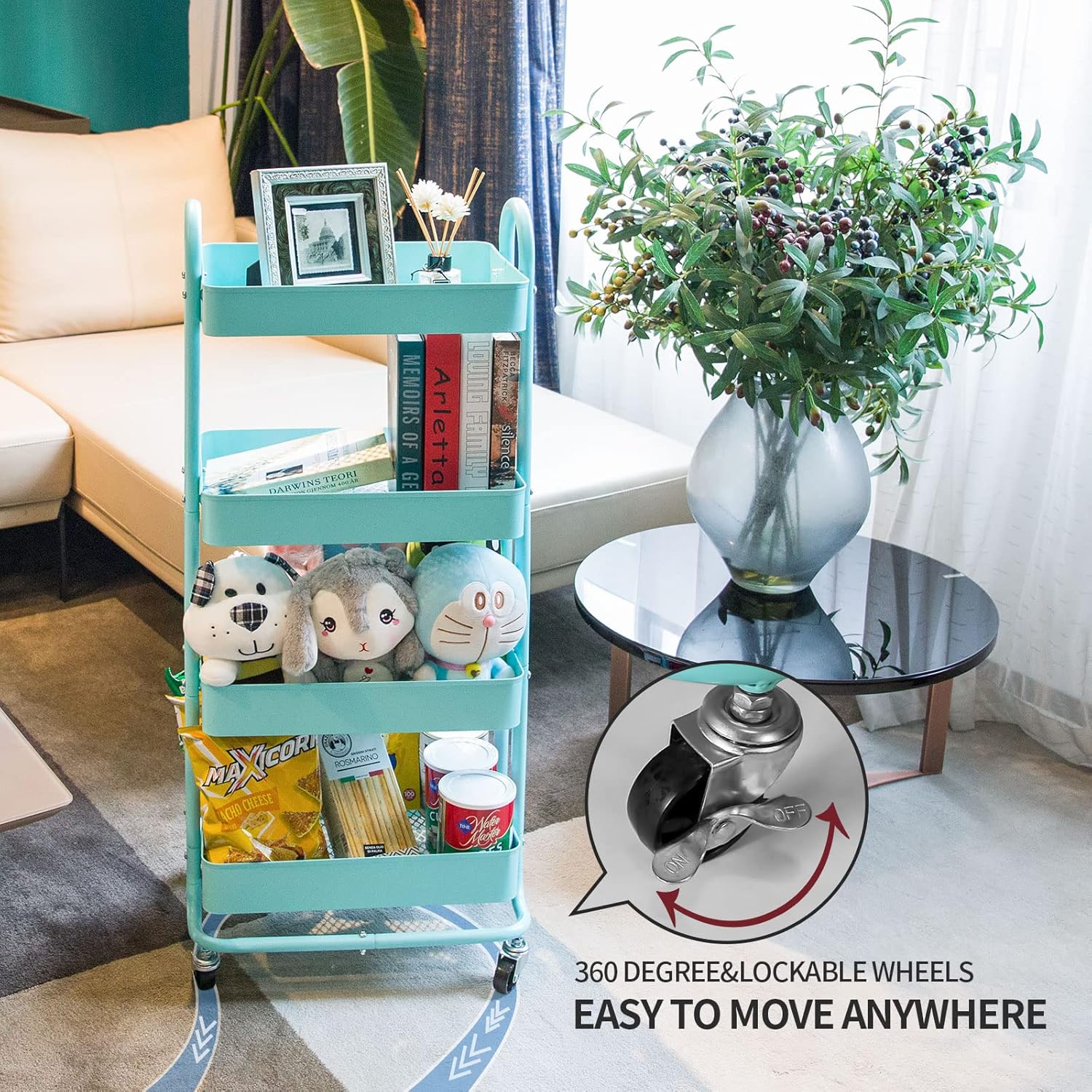 - [Move Anywhere] This 4-Tier storage cart equipped with 4 wheels (2 lockable) and 2 handles design makes it easy and convenient to keep the cart roll around to anywhere.