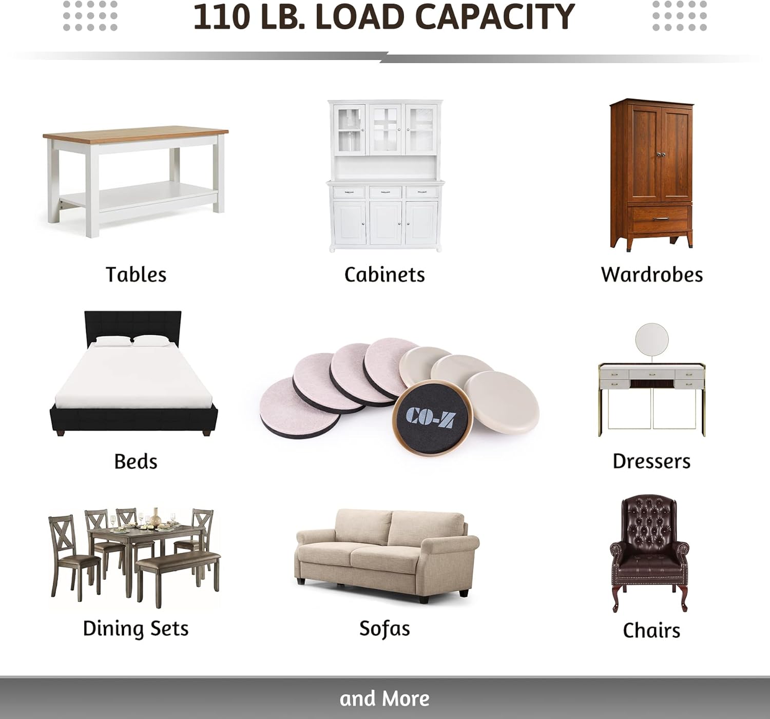 - 8-Piece Moving Kit: This CO-Z round furniture slider kit supports up to 110 lb., making it easy to move large heavy furniture across hardwood floors or carpet. With a 3.5" diameter, it's perfect for chairs, beds, cabinets, and other furniture legs