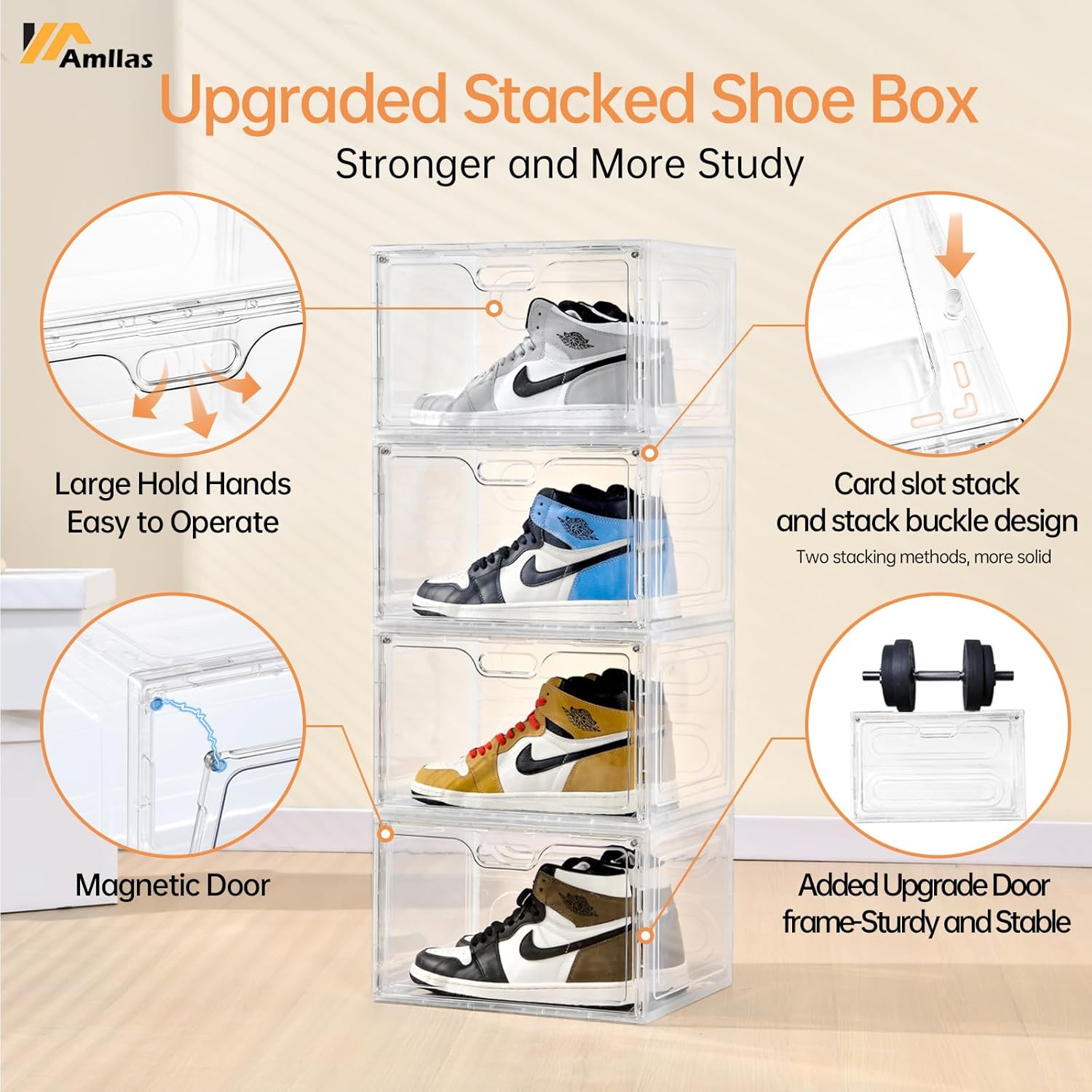 - [New Stackable Design & Space Saving]Our shoe storage boxes are equipped with new stackable design,Which you can stack them by placing them directly.In addition,the stackable function can keep the shoe boxes whole very firmly and can be Multi-layered Stacked.And each stackable shoe bins can stay sturdy and easy to carry when integrated.