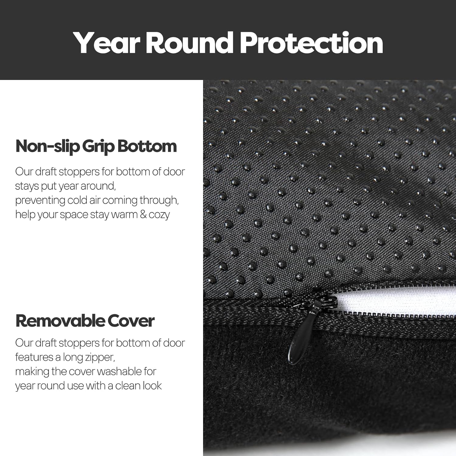 - Year Round Protection: Features non-slip grip bottom, lay evenly on floor year round, prevent draft air coming through. Comes with a removable & washable cover for whole-year clean look