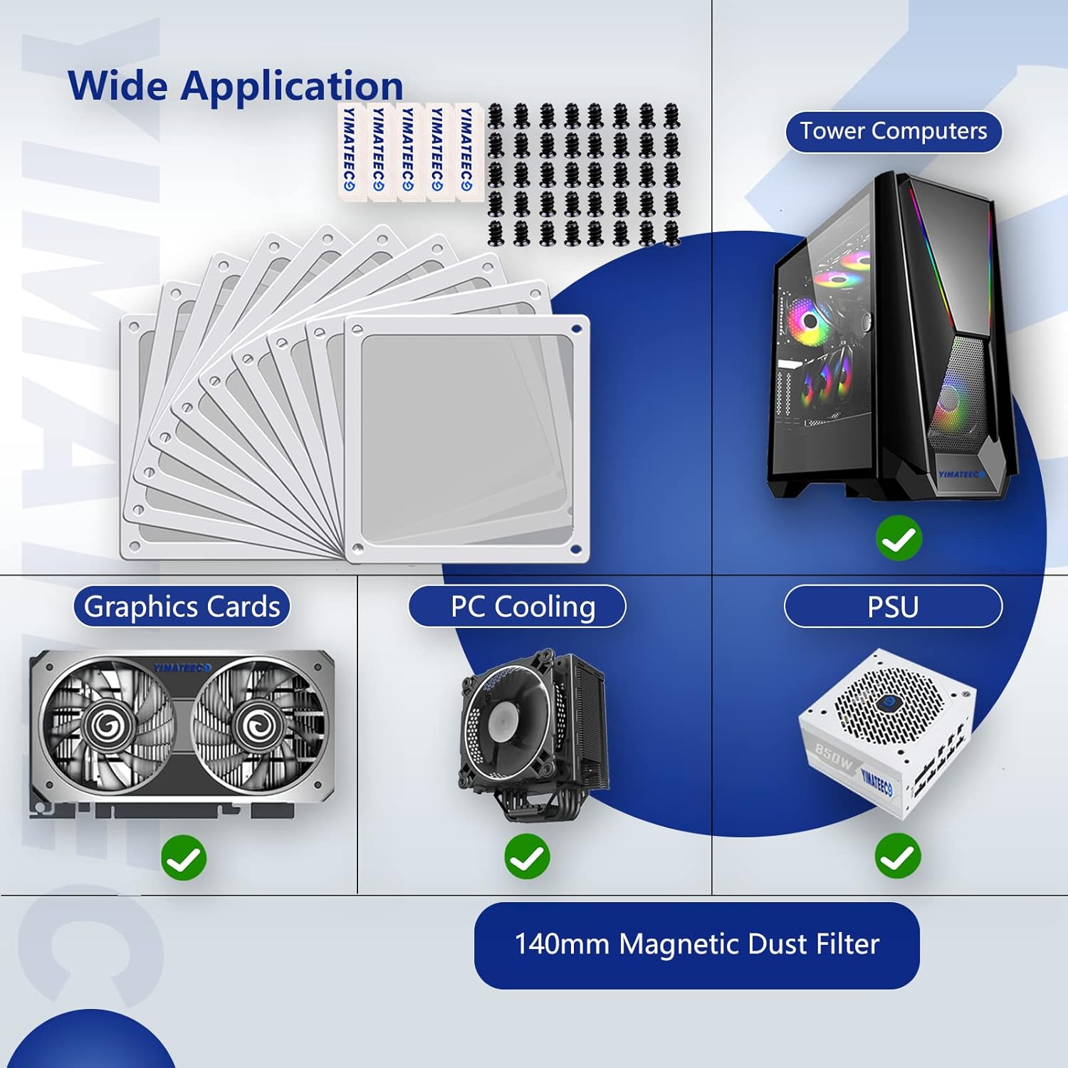 - 【DELIVERY LIST】YIMATEECO Provides: 10 x 140*140mm PC Dust Filter White (NYLON & PVC) + 20 x 40*10mm Nano Gel-Mat(Acrylic) + 40 x 5*10mm M5 Fans Screws(Q235 STEEL).