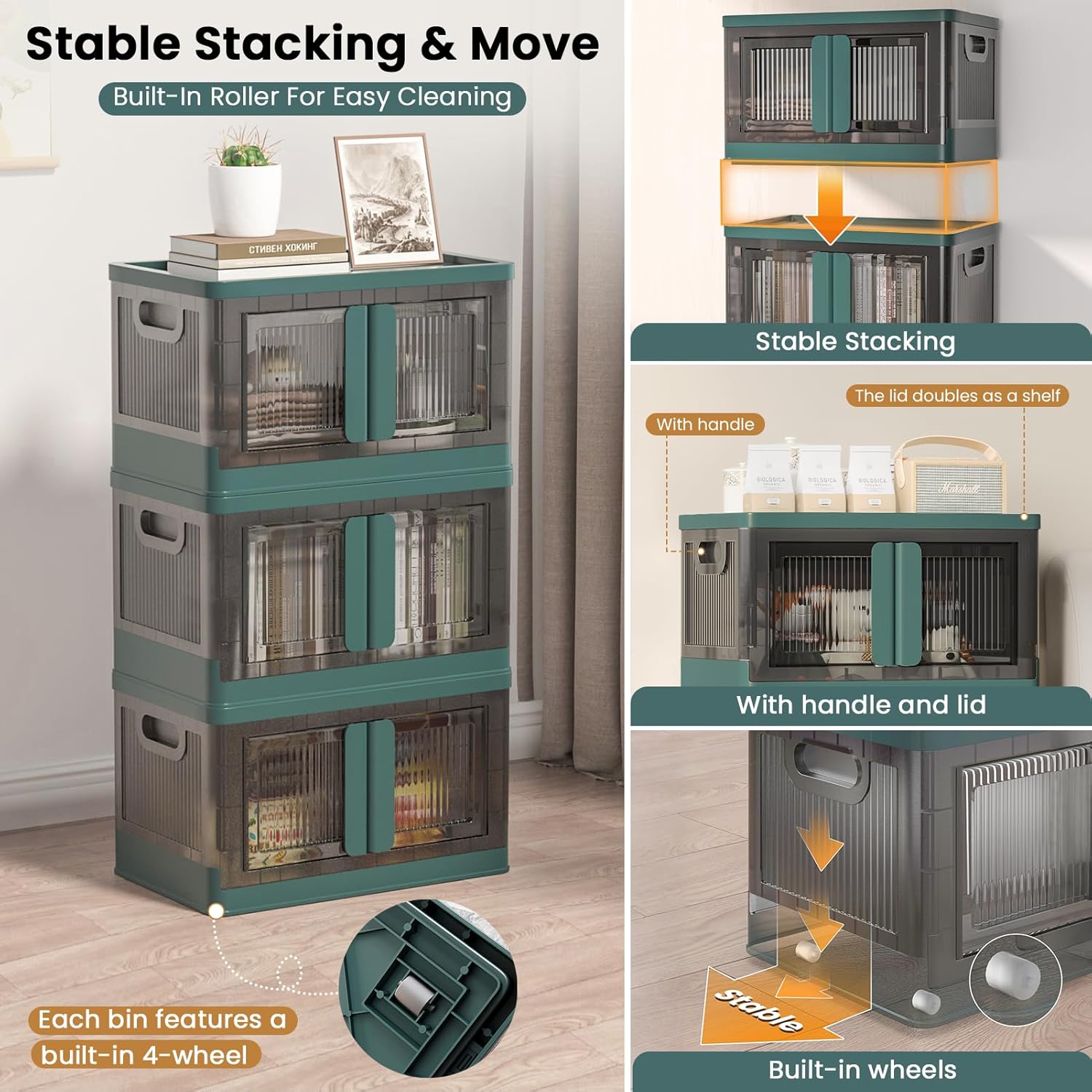 - Stable Stacking & Move: Each storage bin features a built-in recessed 4-wheel base that can move side-to-side, with a full-ground contact design for enhanced stability. The lid of each bin includes 4 built-in grooves for secure stacking