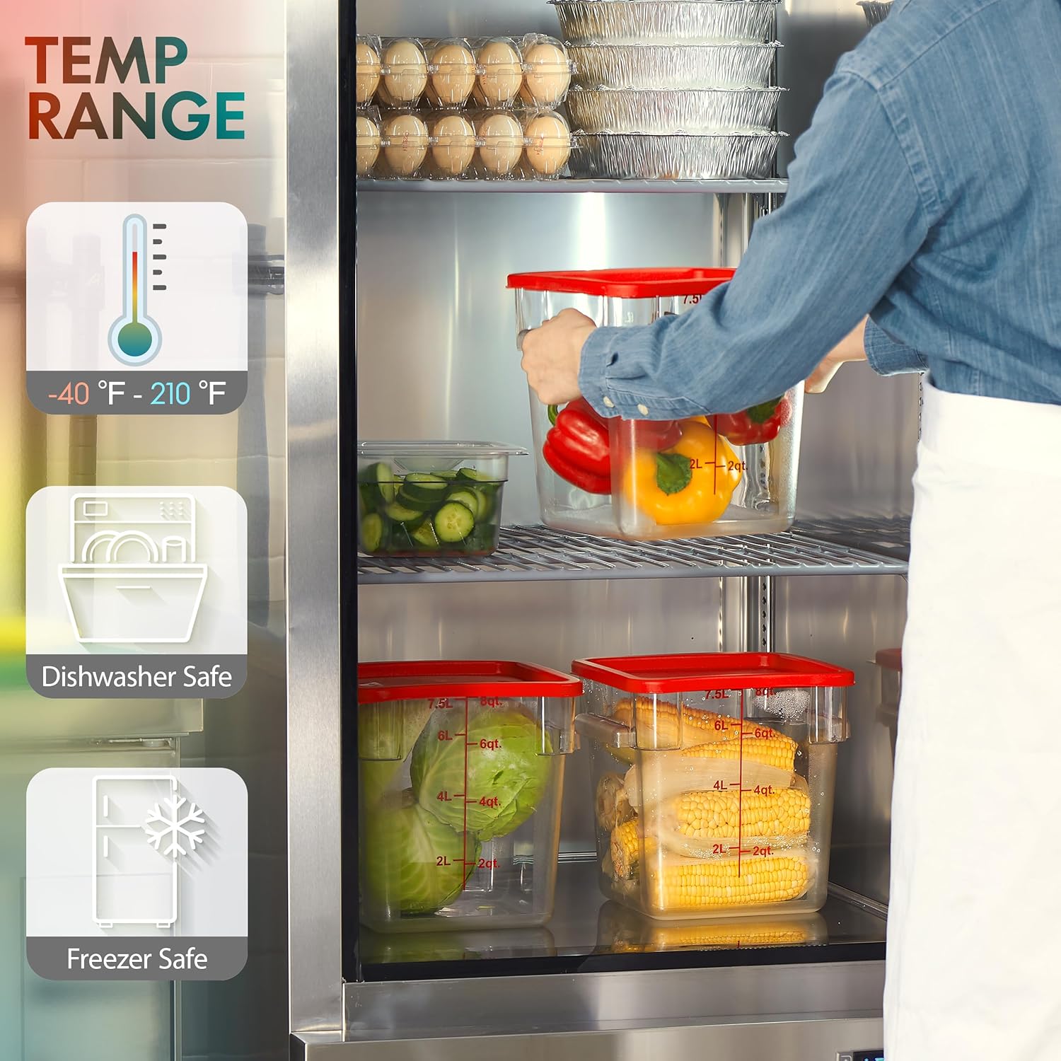 CURTA 4 Pack Food Storage Container with Red Lid - NSF Listed Commercial Grade in 8.0 Qt - Square, Clear, Polycarbonate