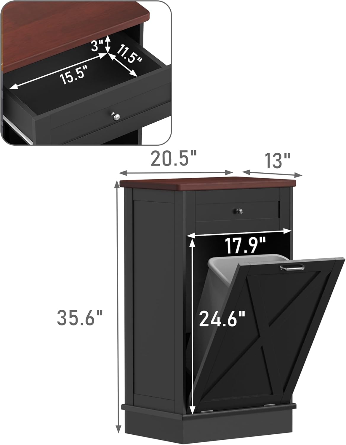 - Durable and Stable: 35.6 "H x 20.5 "L x 13 "W cabinet support is stable enough to hold up to a 35 lb (ca. 16 kg). Our Trash can, a perfect match for a 10-gallon trash can(trash can not included). Rubberwood top surface provides extra cutting space, and can easily withstand even a microwave and coffee maker
