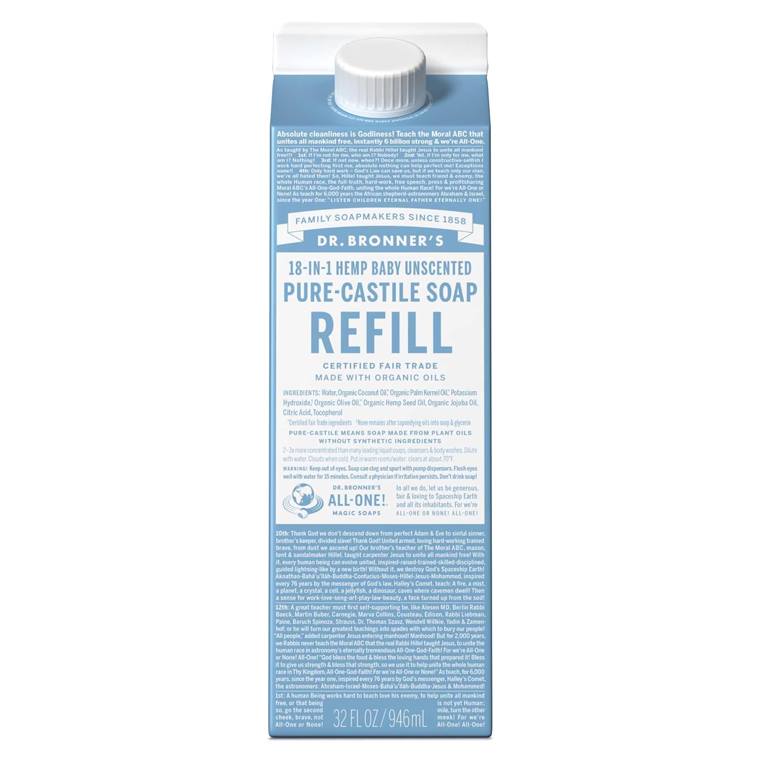 Dr. Bronner's Pure-Castile Liquid Soap Refill - Made with Regenerative Organic Certified Oils, 86% Less Plastic - 18-in-1 Uses, For Face, Body Wash, Hand Soap Refill & More - Baby Unscented, 32oz