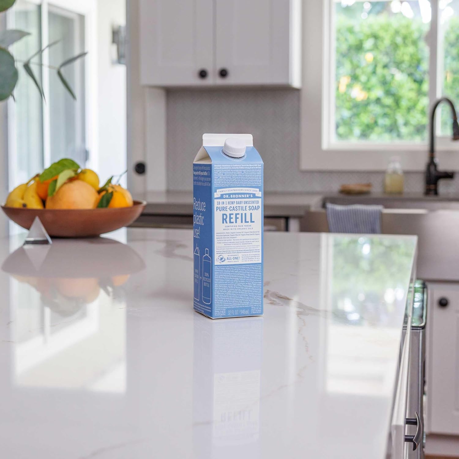 - 3X MORE CONCENTRATED THAN MOST LIQUID SOAPS: Dilute! Dilute! This unscented liquid soap is perfect for face, body, laundry, mopping, dishes, all-purpose cleaning, washing pets, & more. Now in a refill carton with 86% less plastic per quart!