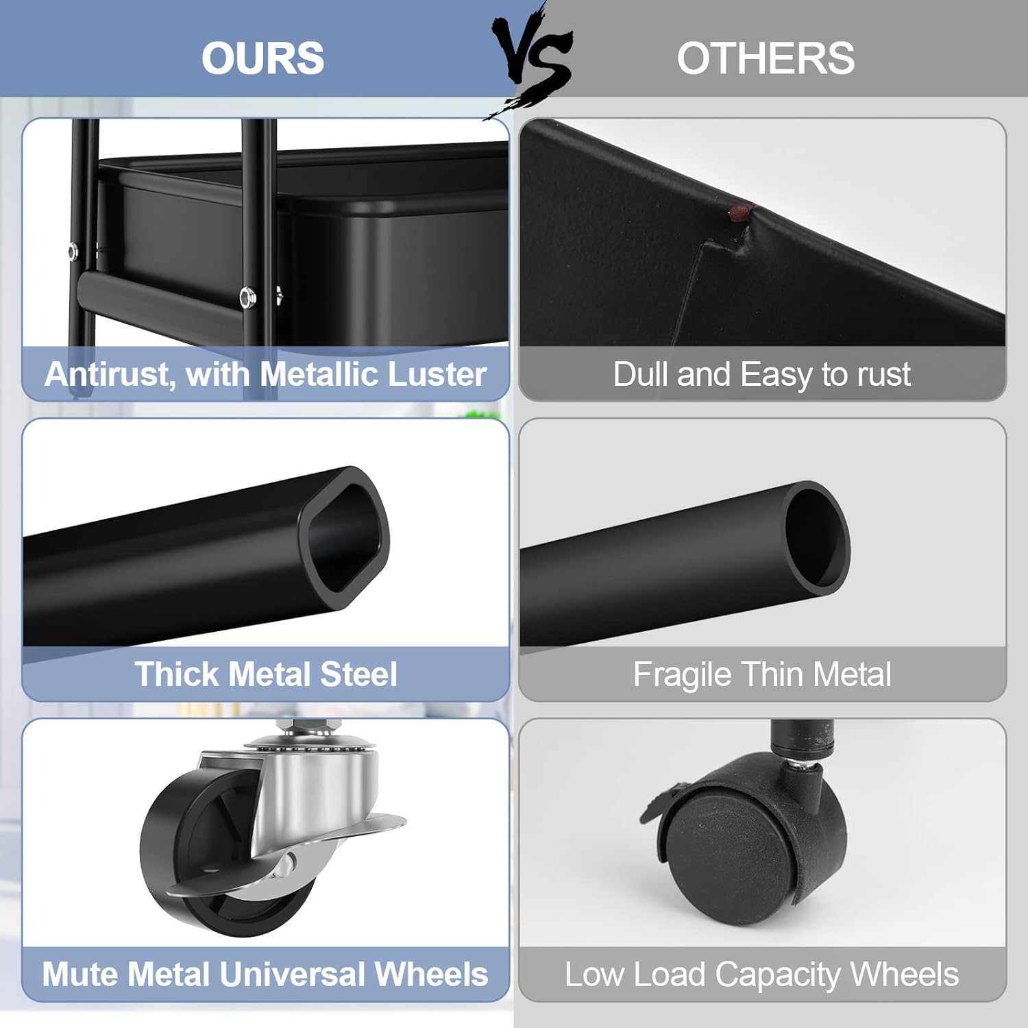 - Sturdy Metal Material, High Load-bearing: The cart is crafted of sturdy steel, sturdy and long to last. It supports 55 LBS per shelf. 3 large and deep baskets provide enough room for your daily essentials, kid supplies, office product, etc.