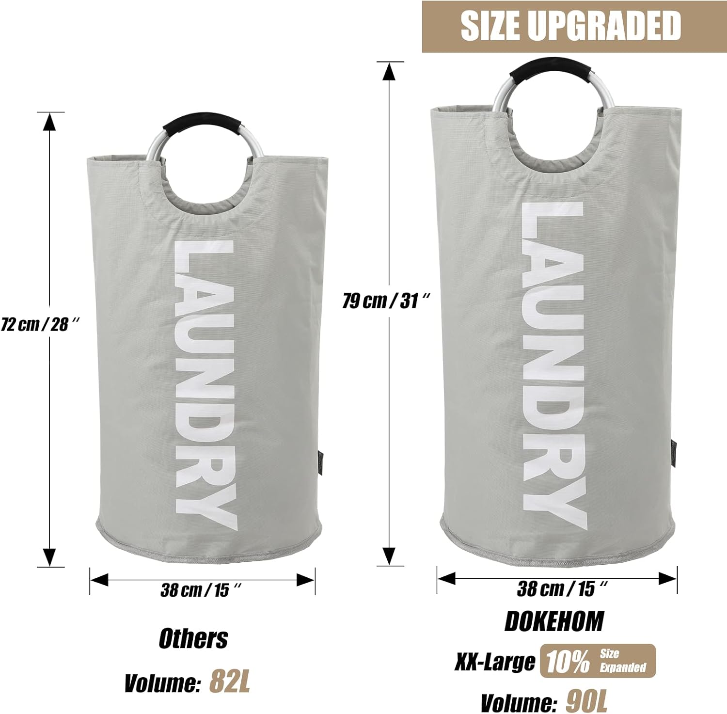 DOKEHOM 90L Large Laundry Basket, Collapsible Laundry Bag, Freestanding Tall Clothes Hamper, Foldable Washing Bin (Grey)