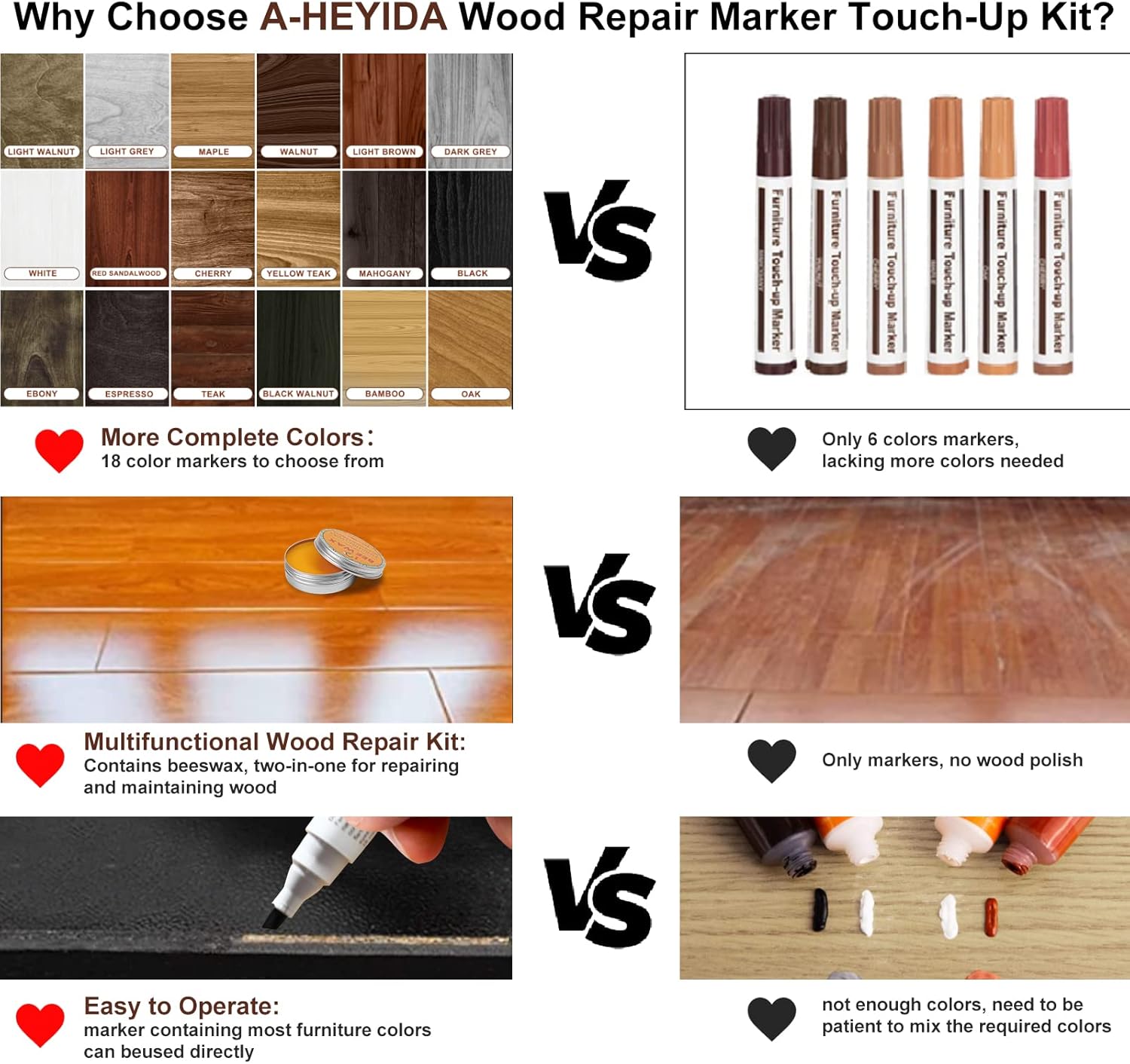 - Furniture Markers Touch Up Kit Tips: The A-HEYIDA wood repair markers are the perfect home improvement tool. It is recommended to test the color on white paper or an inconspicuous place first, so as not to make the color inappropriate