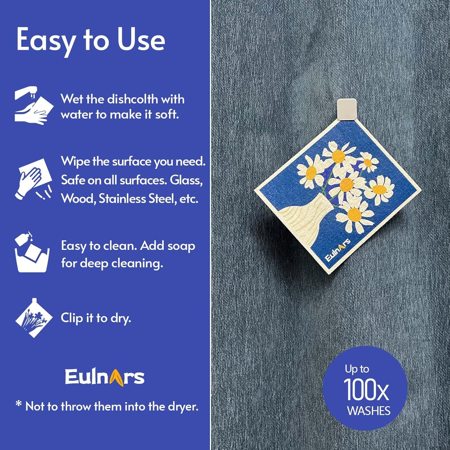 - Easy to Clean and Store: Our swedish dish cloths, measuring 7.8 x 6.8 inches, each set comes with 8 cellulose dish cloths in 4 styles, along with 2 self-adhesive clips, 1 magnetic clip, and 9 labeling tags. Customize storage for easy access, hanging them on walls, counters, or refrigerators to keep your kitchen organized