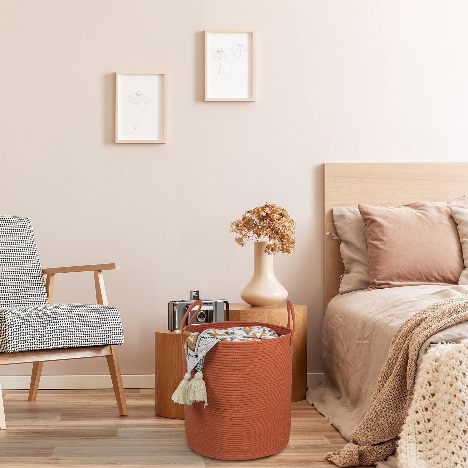 Cotton Rope Laundry Basket Hamper for Clothes Woven Storage Basket for Living Room Bedroom Boho Tall Rope Baskets for Blanket Toys Pillow Towels Baby Nursery Hamper Bin Large rust red
