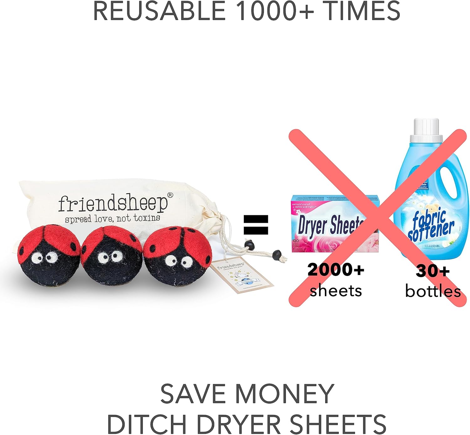 Friendsheep Wool Dryer Balls, Organic Reusable Fabric Softener Alternative for Laundry, Handmade, Fair Trade, Hypoallergenic, Eco-Friendly, Plastic-Free (3 Pack XL – Ladybug)