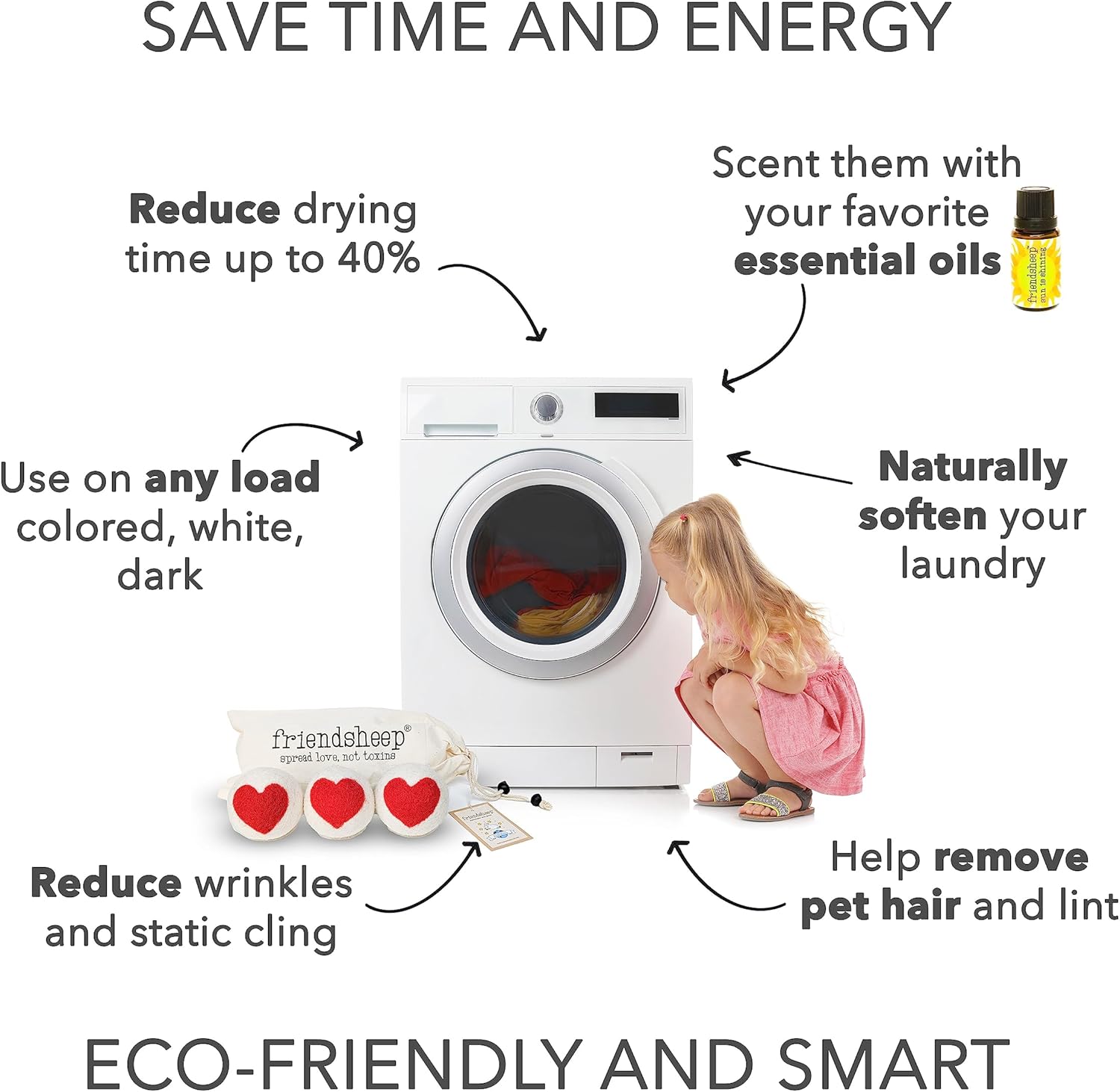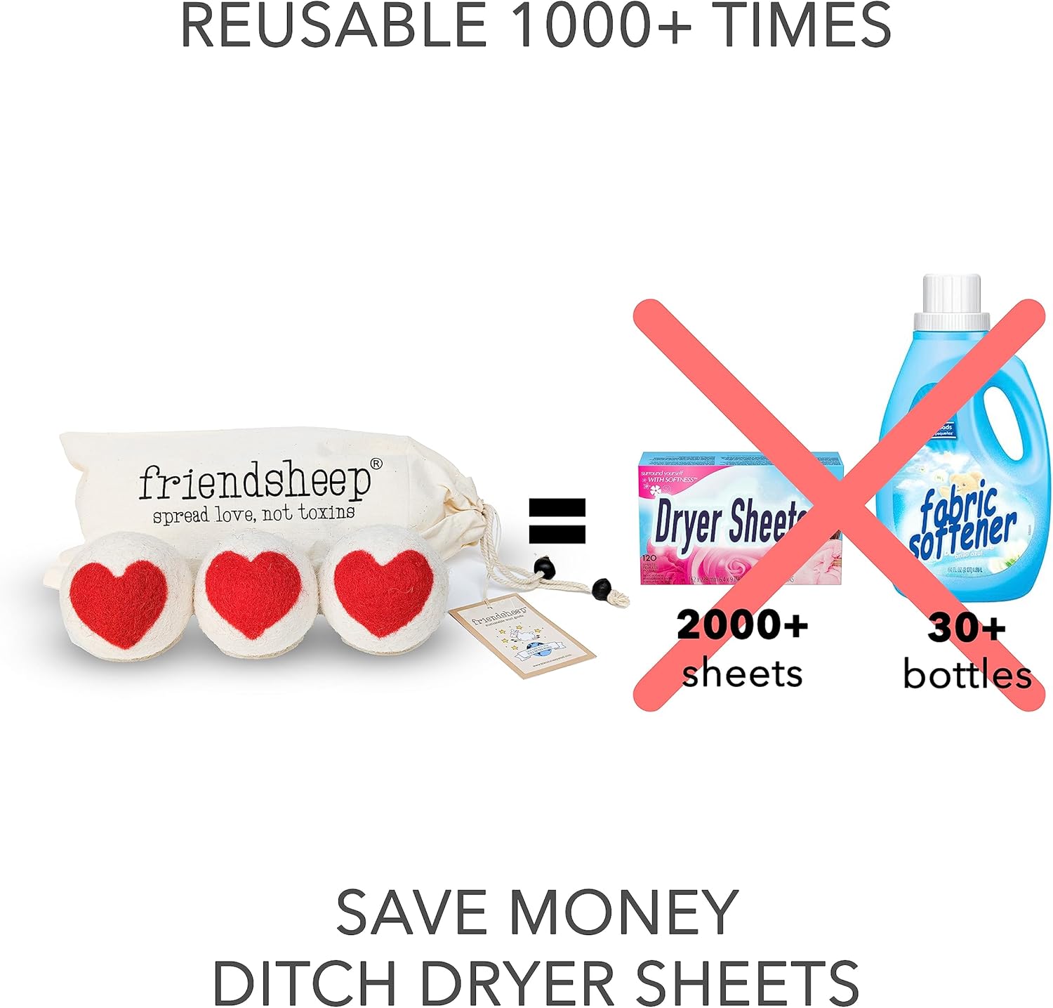 Friendsheep Wool Dryer Balls, Organic Reusable Fabric Softener Alternative for Laundry, Handmade, Fair Trade, Hypoallergenic, Eco-Friendly, Plastic-Free (3 Pack XL – Red Heart)