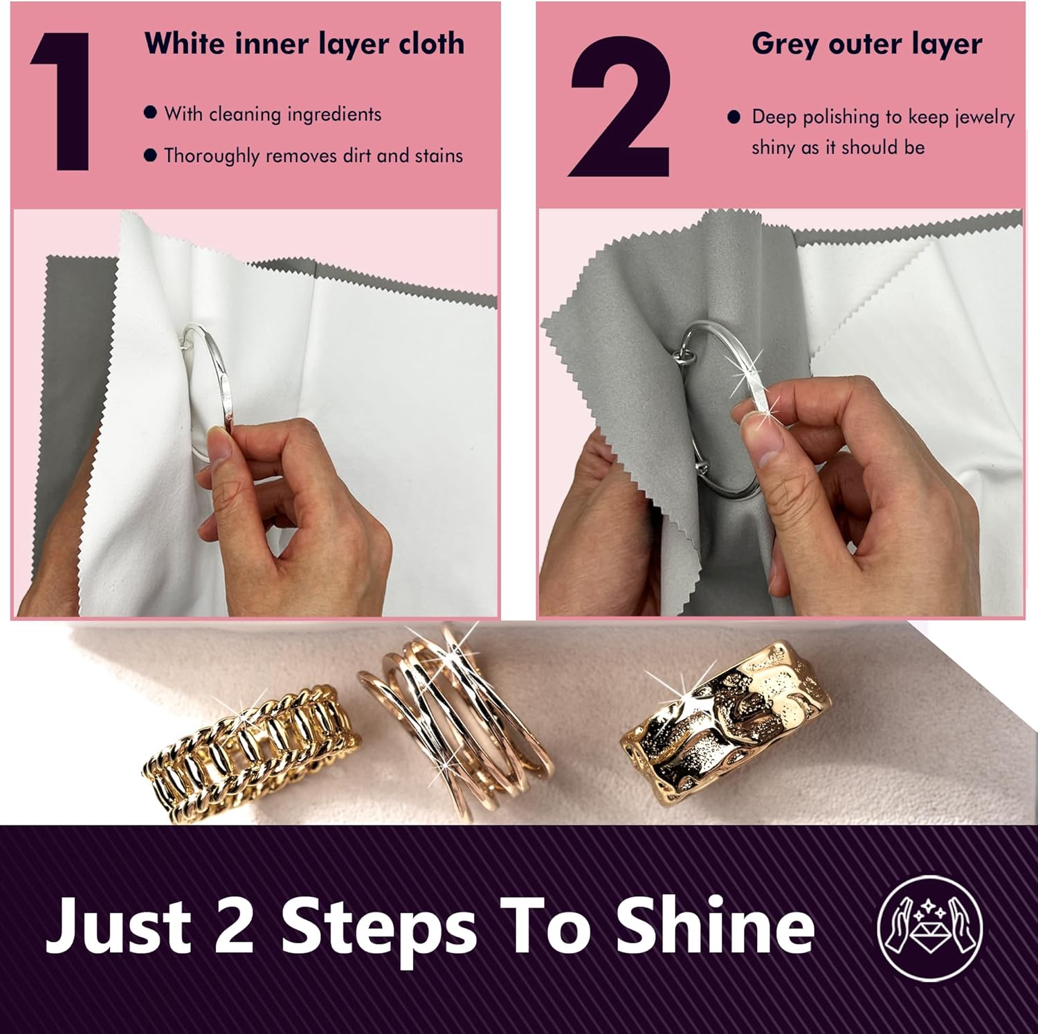 - 【TWO STEP SYSTEM】 The multi-layer of the sterling silver cleaning cloth easily brings your beloved jewelry back to its beautiful shine. First, use the white interior layer with special cleaning ingredients to remove the dirt thoroughly. Next, use the grey/black outer layer to polish and shine